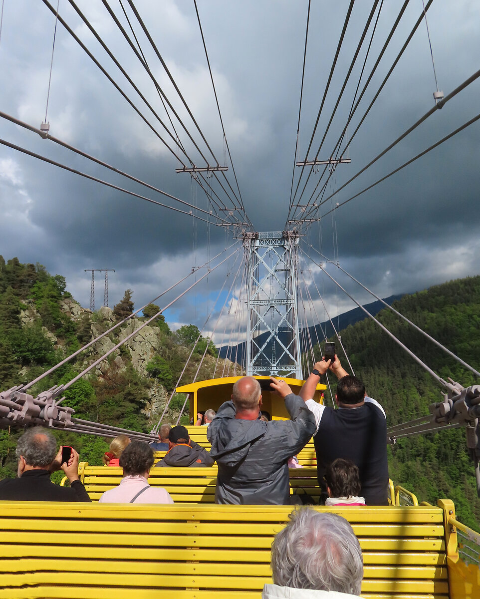 Eindrückliche Fahrt im offenen Wagen über die imposante Hängebrücke 'Pont de Cassagne' mit ihrer beeindruckenden Bauweise. Villefranche - Vernets-les-Bains, 24.5.2023