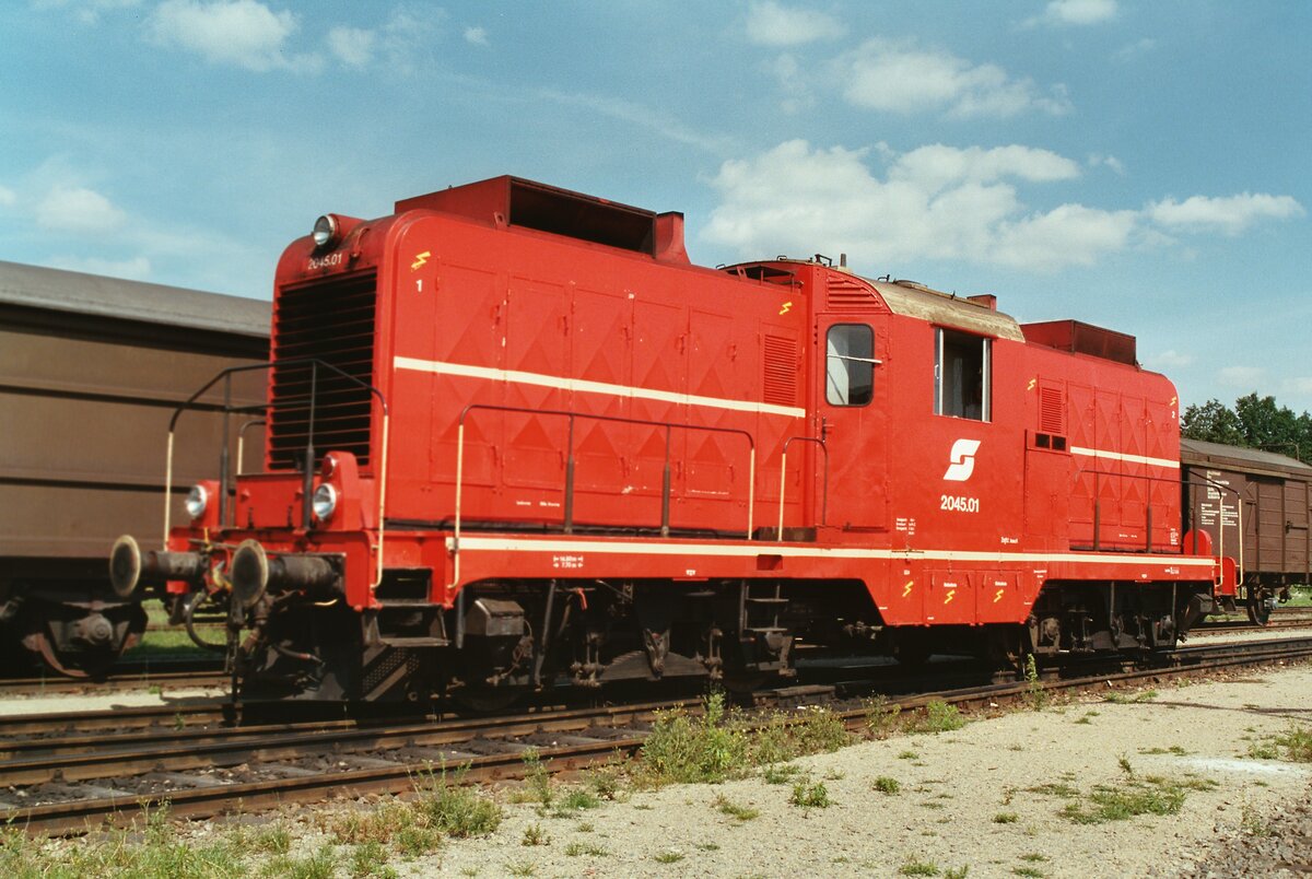 FS E.645 XXX zieht ÖBB 1044 245 und 1044 XXX von einem aus Richtung Innsbruck angekommenen Zug ab und wird sie wieder unter die Fahrleitung des österreichischen Stromsystems stoßen (Brennero/Brenner, 29.06.2000); digitalisiertes Dia. - Im Grenzbahnhof Brennero/Brenner verläuft die nicht umschaltbare Systemtrennstelle zwischen dem österreichischen 15 kV Wechselstrom- und dem italienischen 3 kV Gleichstromsystem, ein Stromsystem beschränkt sich auf die jeweilige Bahnhofsseite. Etwa in der Mitte des Bahnhofs befindet sich über allen durchgehenden Gleisen ein neutraler Abschnitt, unter dem die Lokomotiven mit gesenkten Stromabnehmern unter die Fahrleitung des jeweils anderen Systems rollen. Einsystemlokomotiven werden von einer Diesellok (FS D 245) oder, wie in diesem Fall, von der/den neuen Zuglok/s vom Zug  abgezogen und wieder unter das eigene Stromsystem zurückgegestoßen; Mehrsystemlokomotiven können aus eigener Kraft wieder unter das eigene System fahren.