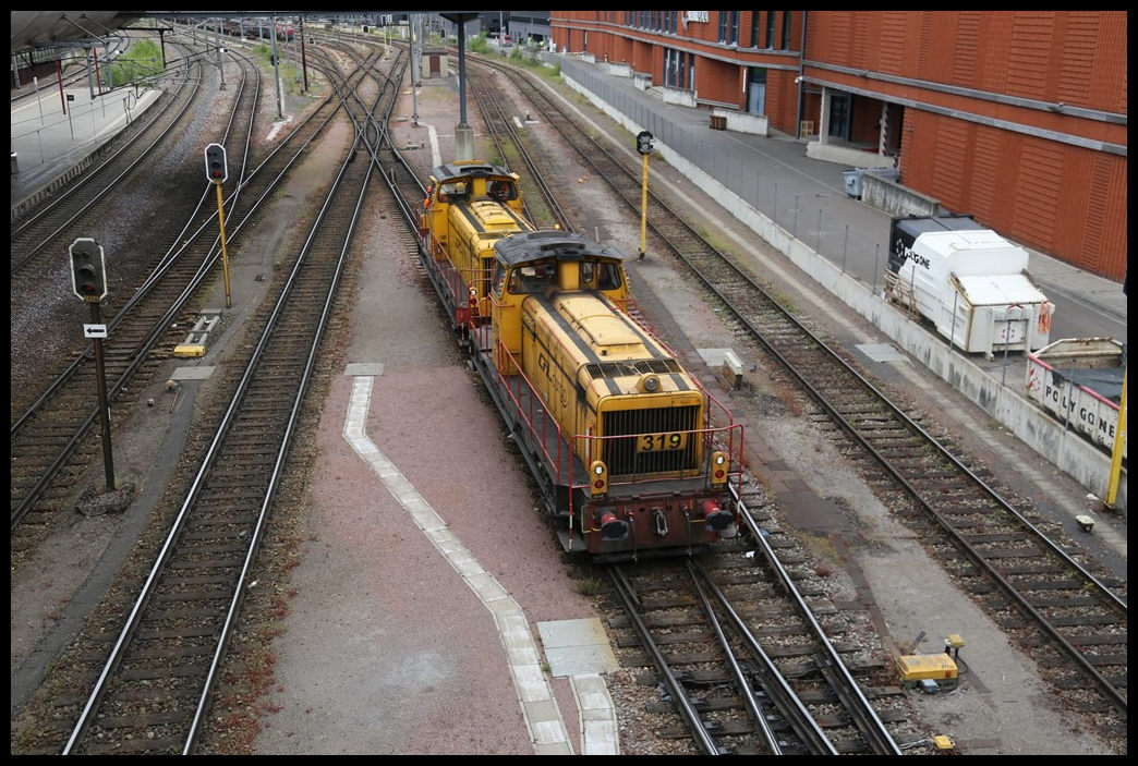 Im Bahnhof Belval Unitversite ist noch immer Werkverkehr zu beobachten. Am 23.5.2023 rangierten dort die CFL Werkloks 319 und 314 unterhalb der Fußgängerbrücke.
