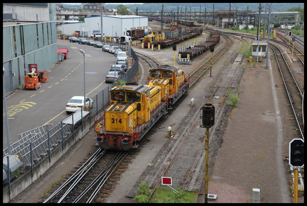 Im Bahnhof Belval Unitversite ist noch immer Werkverkehr zu beobachten. Am 23.5.2023 rangierten dort die CFL Werkloks 319 und 314 unterhalb der Fußgängerbrücke. Im Hintergrund sind weitere Werklokomotiven zu erkennen.