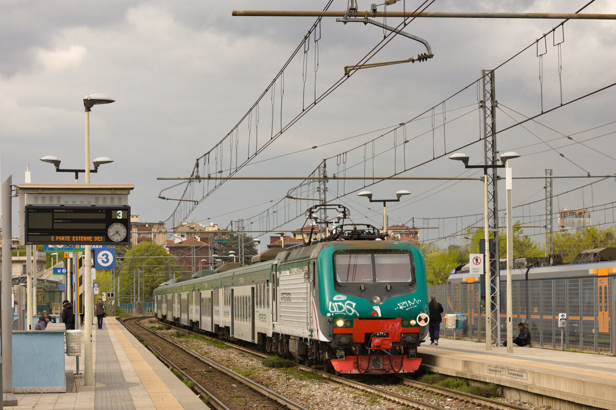 In Domodossola wartet im letzten Licht des kurzen Tages der FS Trenitalia  Treno 13 , bestehend aus dem schiebenden Ale 724 055, einem Mittelwagen und dem Steuerwagen Le 724 014, auf die Abfahrt nach Novara.
