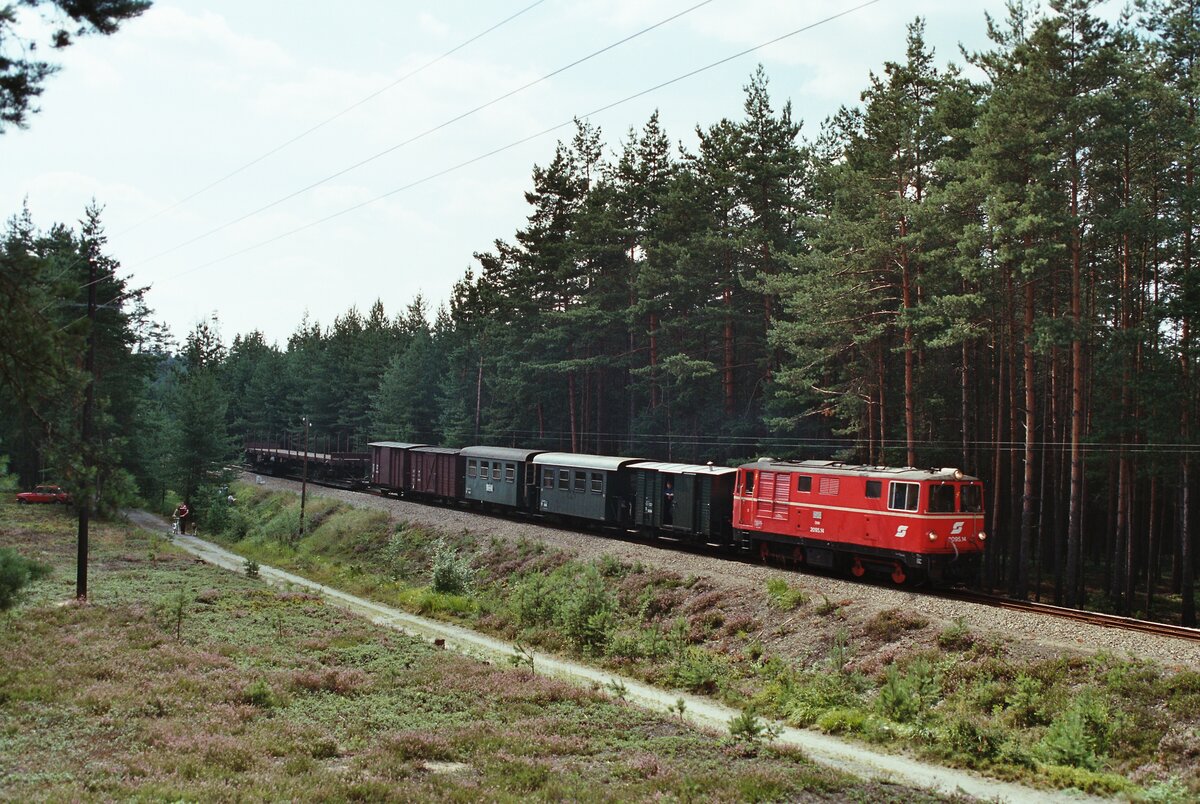 Der LEB Be 4/4 26 ist bei Fey mit einem Leermaterialzug auf dem Weg nach Echallens. Die Komposition verkehrte als LEB Schnellzug D 27 (fett gedruckt im Fahrplan!) von Lausanne Flon nach Bercher und wird am späteren Nachmittag ab Echallens als Schnellzug nach Lausanne zurückfahren.