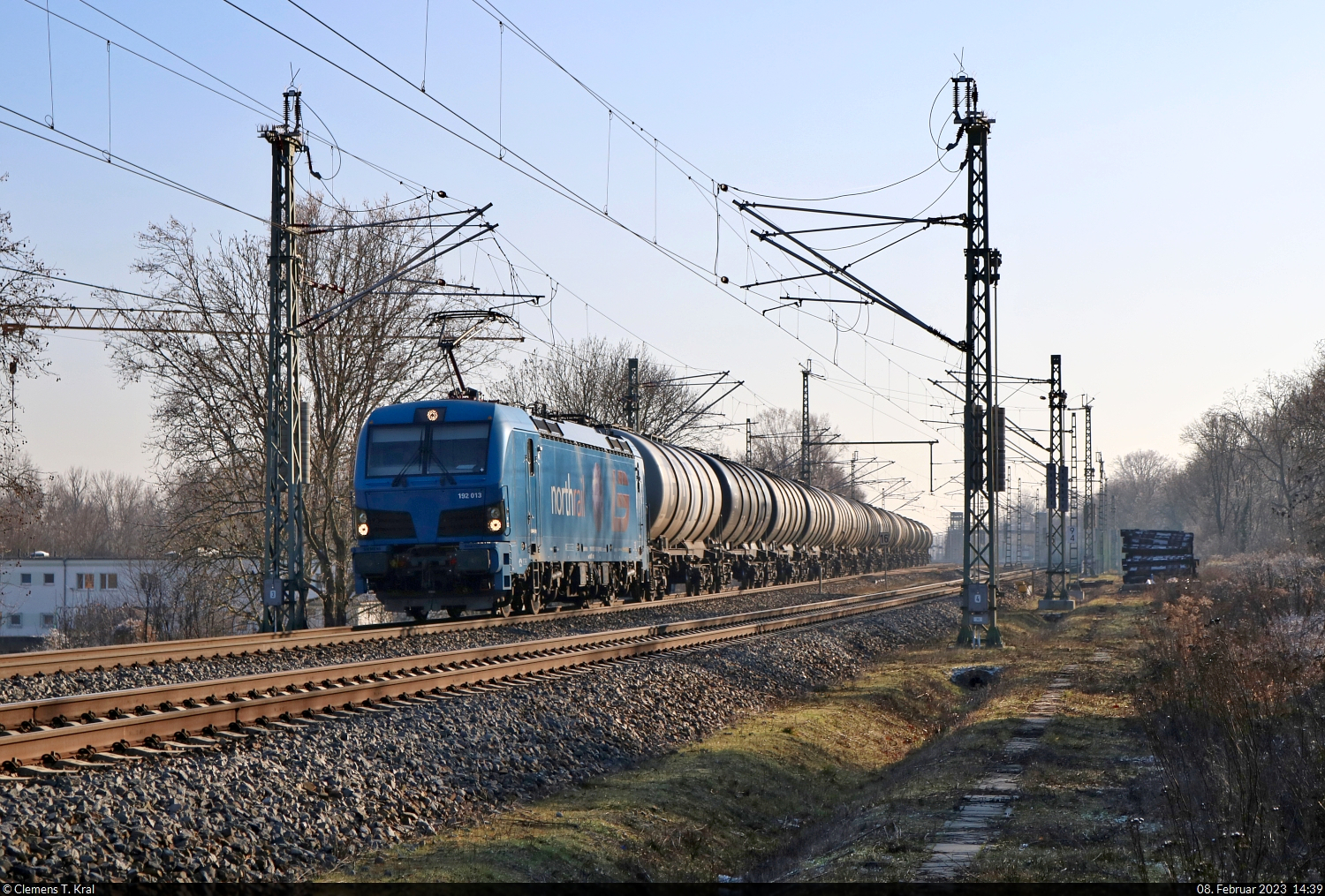 192 013-1 (Siemens Smartron) kesselt durch Schkopau Richtung Halle-Ammendorf. 🧰 RIVE Rail Leasing Limited (RRL), eingestellt bei der northrail GmbH und vermietet an die Leipziger Eisenbahnverkehrsgesellschaft mbH (LEG) 🕓 8.2.2023 | 14:39 Uhr
