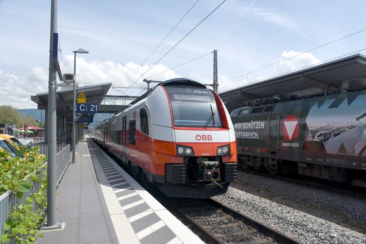 BREGENZ (Vorarlberg), 09.05.2023, Zug 4748 010-7/4748 510-6 als REX1 nach Bludenz im Bahnhof Bregenz