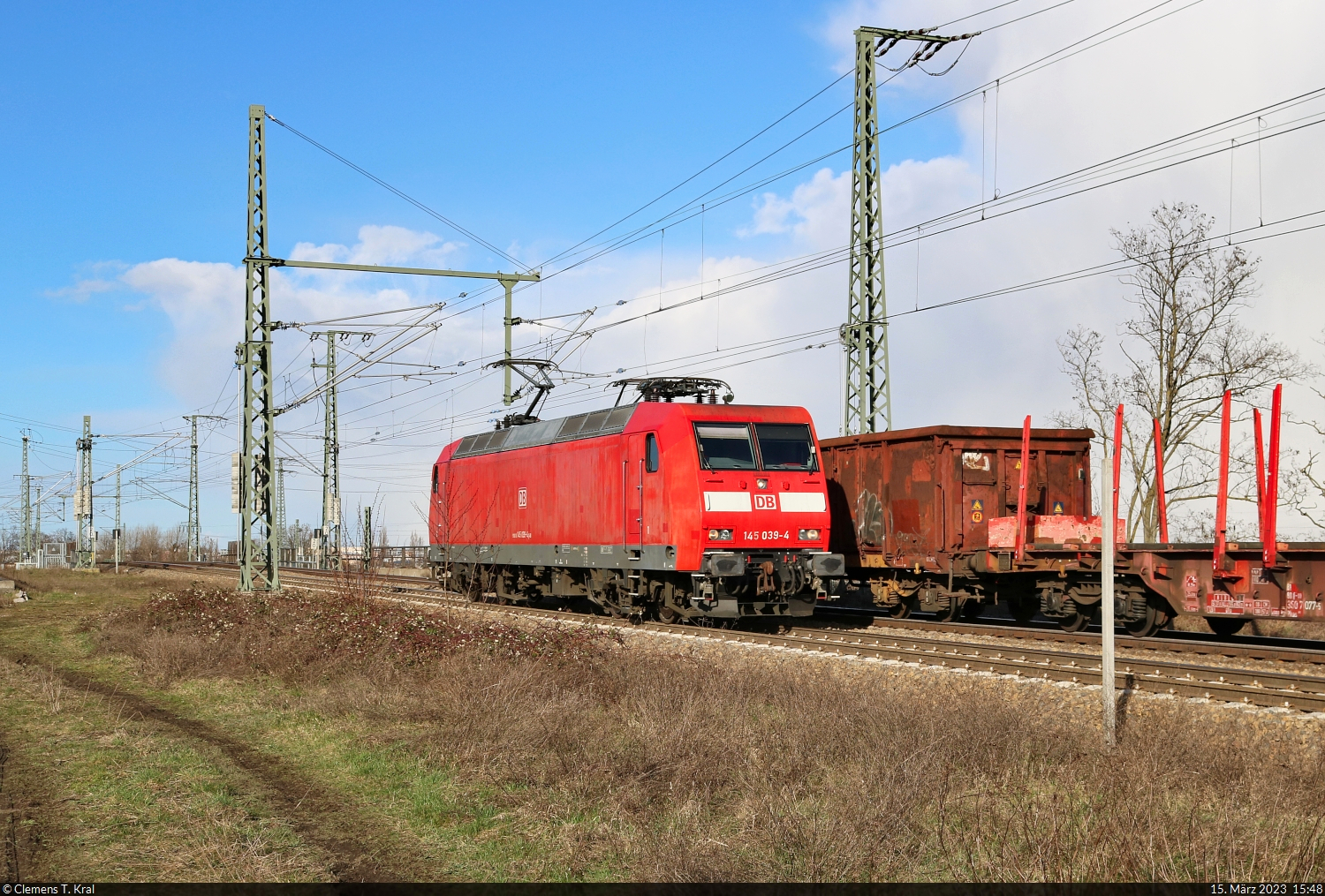 145 039-4 ist als Tfzf Richtung Abzweig Halle Thüringer Bahn unterwegs und begegnet oberhalb der Leipziger Chaussee (B 6) einem gemischten Gz.