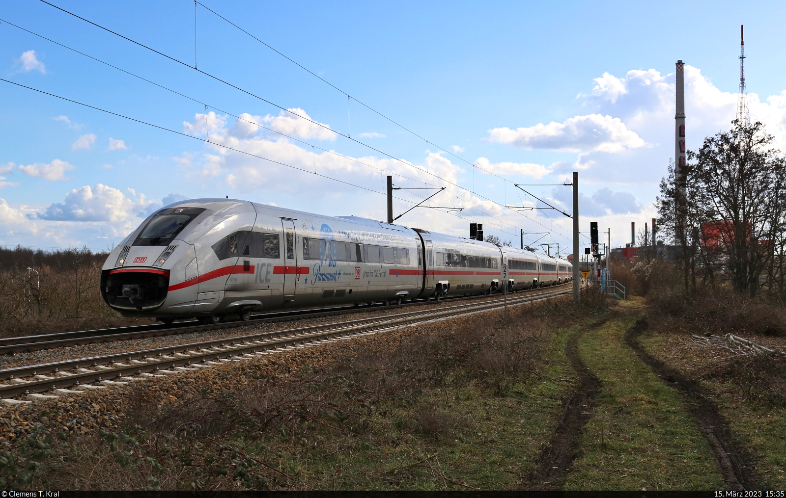 Mit unbekanntem Ziel und offenem Maul kommt 812 019-8 (Tz 9019) auf der Güterbahn oberhalb der Bundesstraße 6 in Halle (Saale) Richtung Zugbildungsanlage (ZBA) gefahren. Er warb von Januar bis März 2023 für den Streaming-Dienst Paramount+, der in den ICE-Zügen genutzt werden kann.