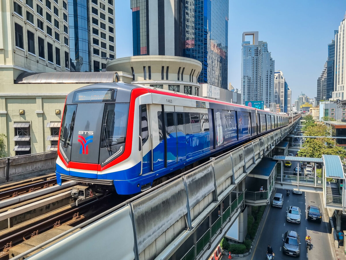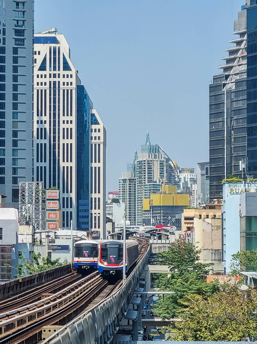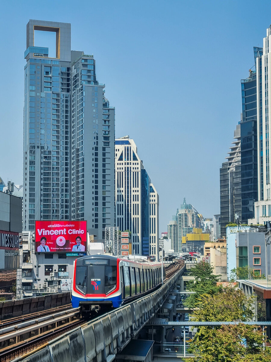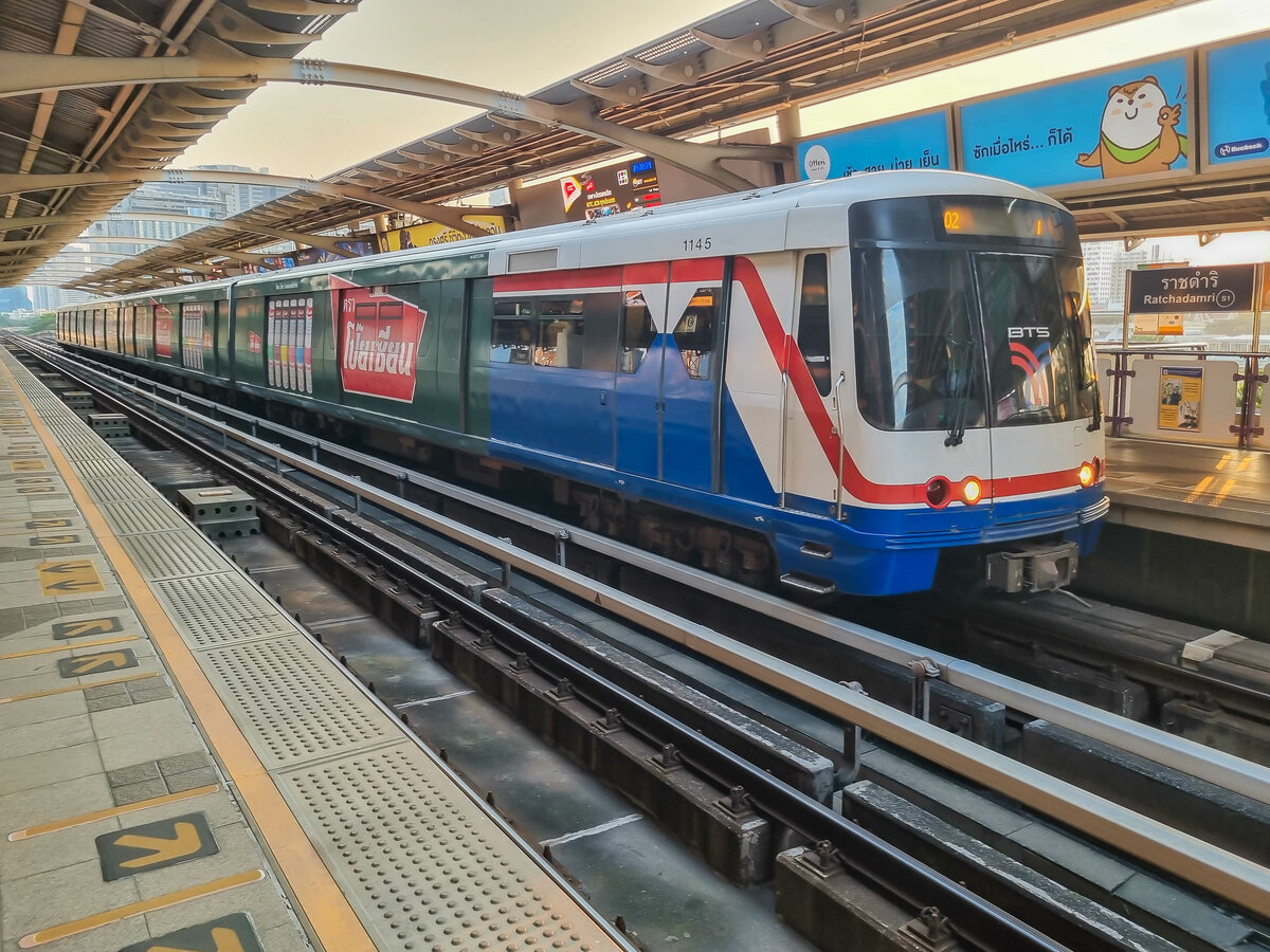 Bangkok BTS Skytrain Zug 1463 der Sukhumvit Line in Richtung Kheha bei der Einfahrt in der Station Chit Lom, 21.02.2023.