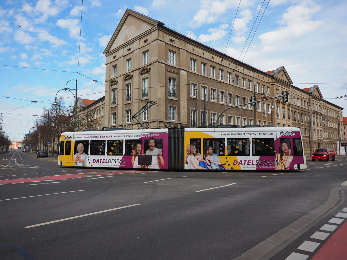 Treffen zweier Gelenktriebwagen NGT6DE (Wagen 303 & 306) auf der Linie 1 in Dessau mit Blick nach Norden Richtung Stadtzentrum.