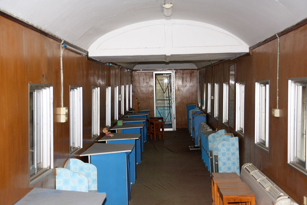 Blick in den zweiten Wagen (als "The Informal Learning Resources Carriage" bezeichnet) des Unterrichtszuges bei der alten Uttaridt Station. Bild vom 26.März 2023.