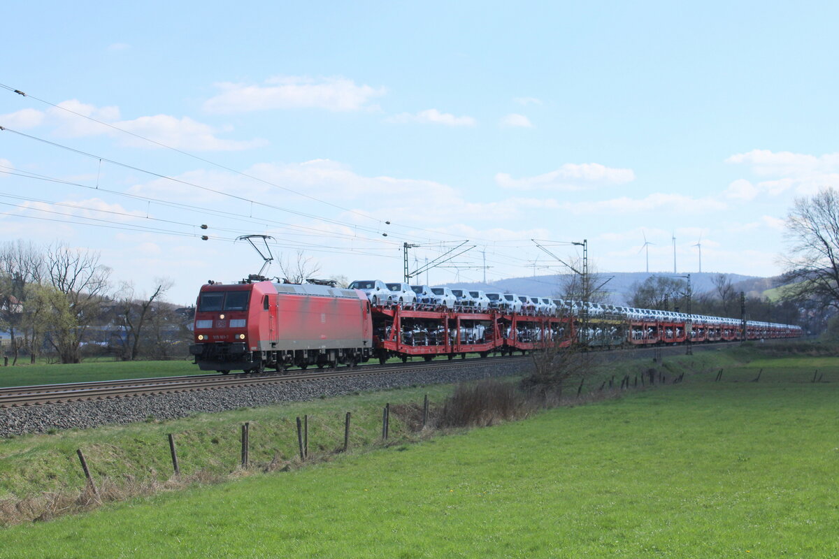 DB 185 161-7 mit Autotransportwagen Richtung Bebra, am 05.04.2023 in Hauneck.