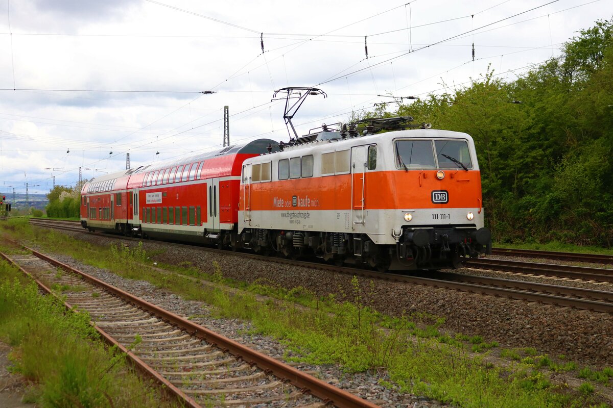 DB Gebrauchtzug 111 111-1 mit dem RB49 Ersatzzug am 29.04.23 in Niddatal Assenheim