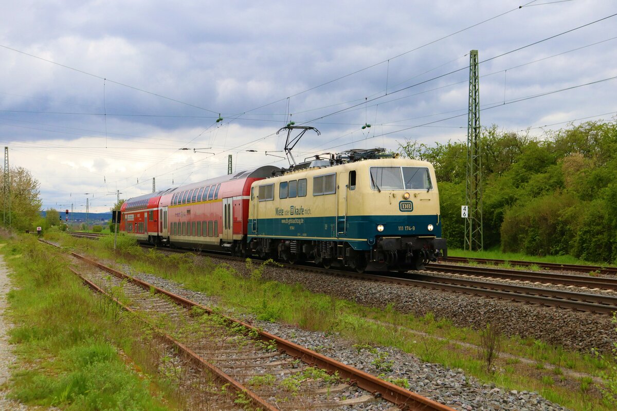 DB Gebrauchtzug 111 174-9 mit dem RB49 Ersatzzug am 29.04.23 in Niddatal Assenheim
