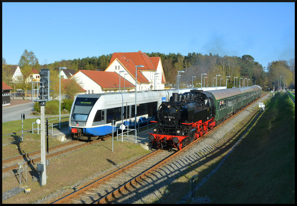 Zugkreuzung in Bergen mit einem IC von Binz und dem ICE GÜSTROW, mit voller Beleuchtung bei dieser Aufnahme, nach Binz. - 30.04.2023 - Aufnahme von der Fußgängerbrücke.