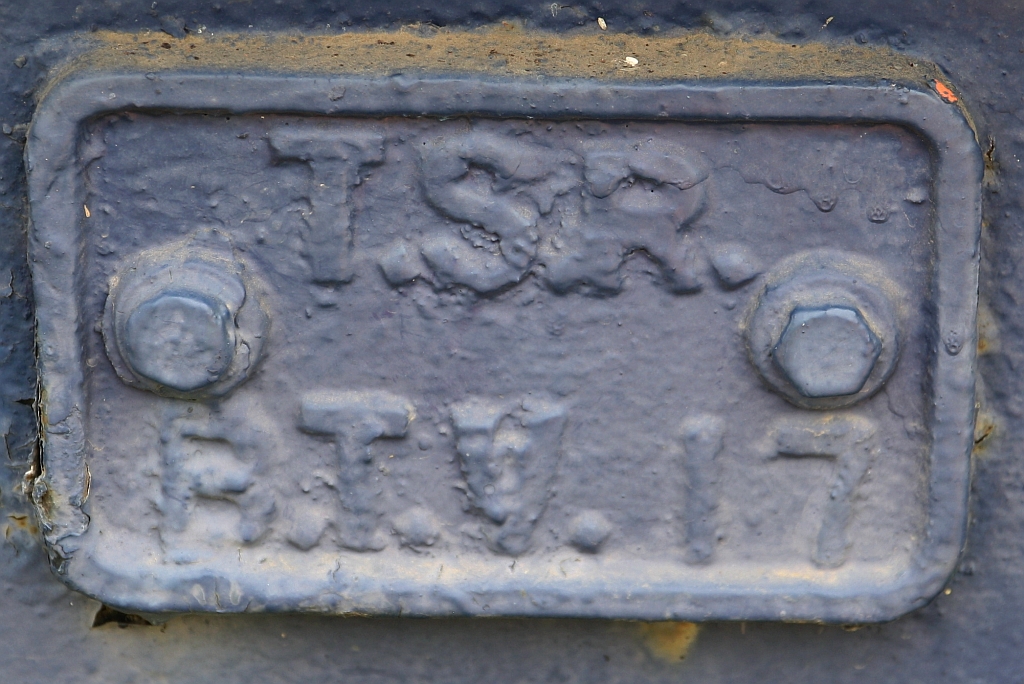 Fahrzeugnummernschild des บสพ. 17 (บสพ. =BTV./Bogie Third Class & Van, Hersteller: Cravens Railway Carriage & Wagon Company/Sheffield, Bauj. 192?). Bild vom 26.März 2023.