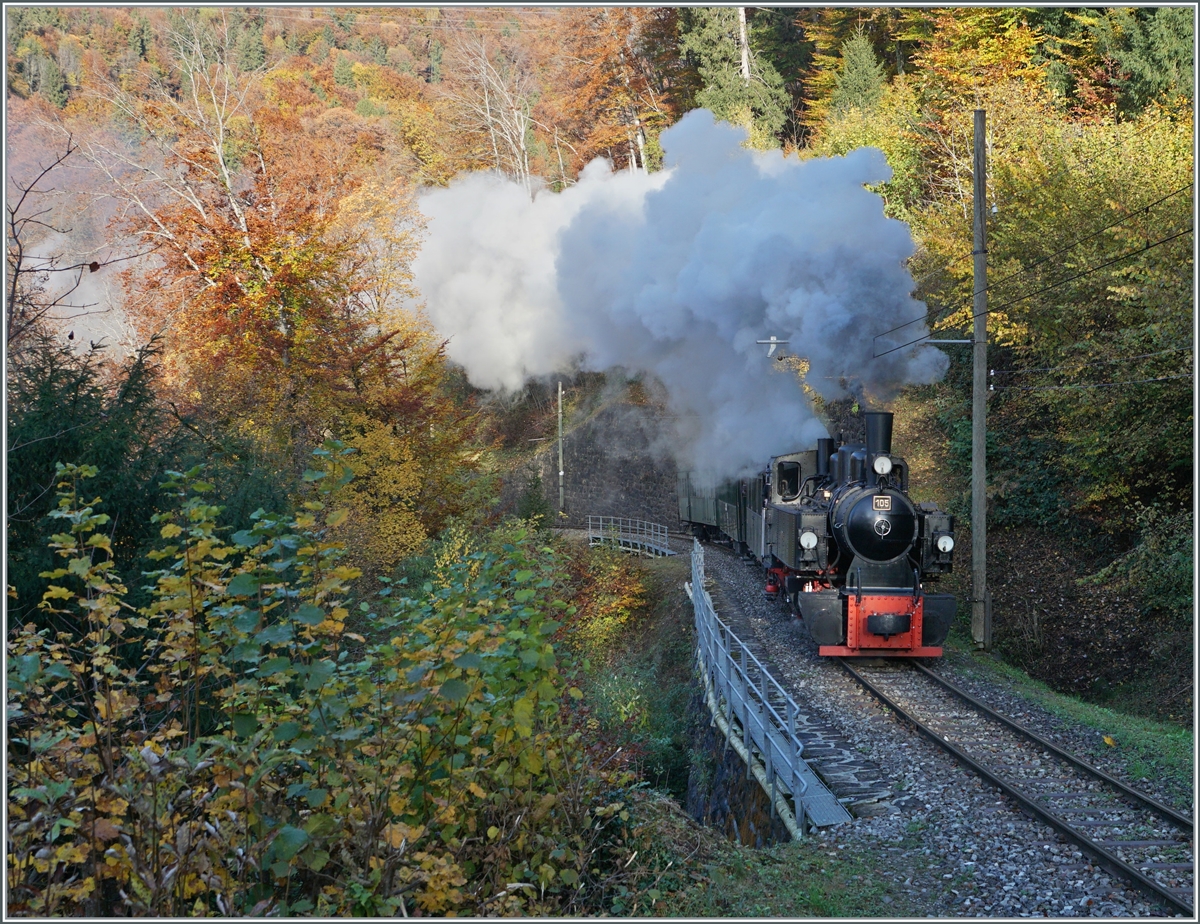 Kräftig dampfend nimmt die Blonay-Chamby G 2x 2/2 105 nach der Langsamfahrstelle (10 km/h) über den Baye de Clarens Viadukt die anschliessende Steigung in Angriff.