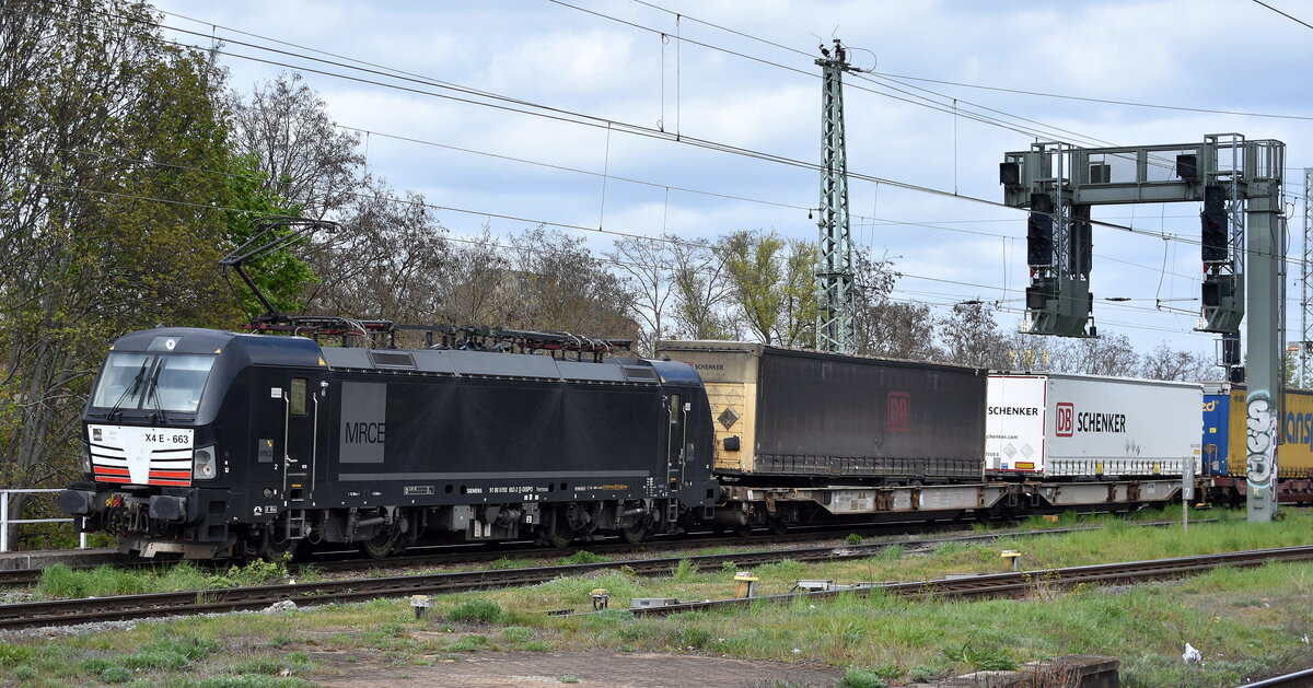 MRCE Vectron "X4 E - 663" [NVR-Nummer: 91 80 6193 663-2 D-DISPO], möglicherweise für DB Cargo? mit einem KLV-Zug am 02.05.23 Vorbeifahrt Bahnhof Magdeburg Neustadt.