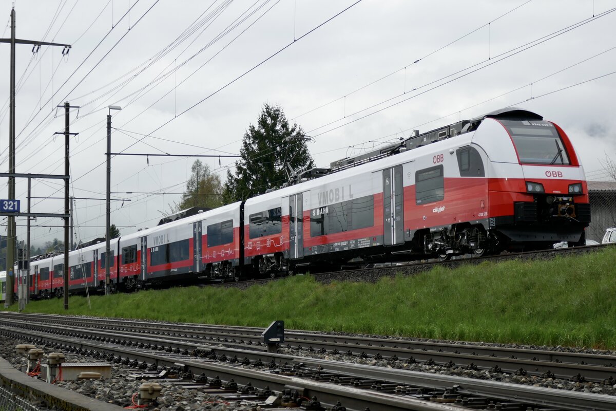 In einer ungewöhnlichen Komposition (im Sandwich zweier SIEMENS Vectron Dual Mode) fährt ein Schienenprüfzug (SPZ 3), auf Prüffahrt (der Messwagen ist auf die Schiene absenkt) am 30.04.2023 durch den Bahnhof Kirchen an der Sieg in Richtung Siegen.