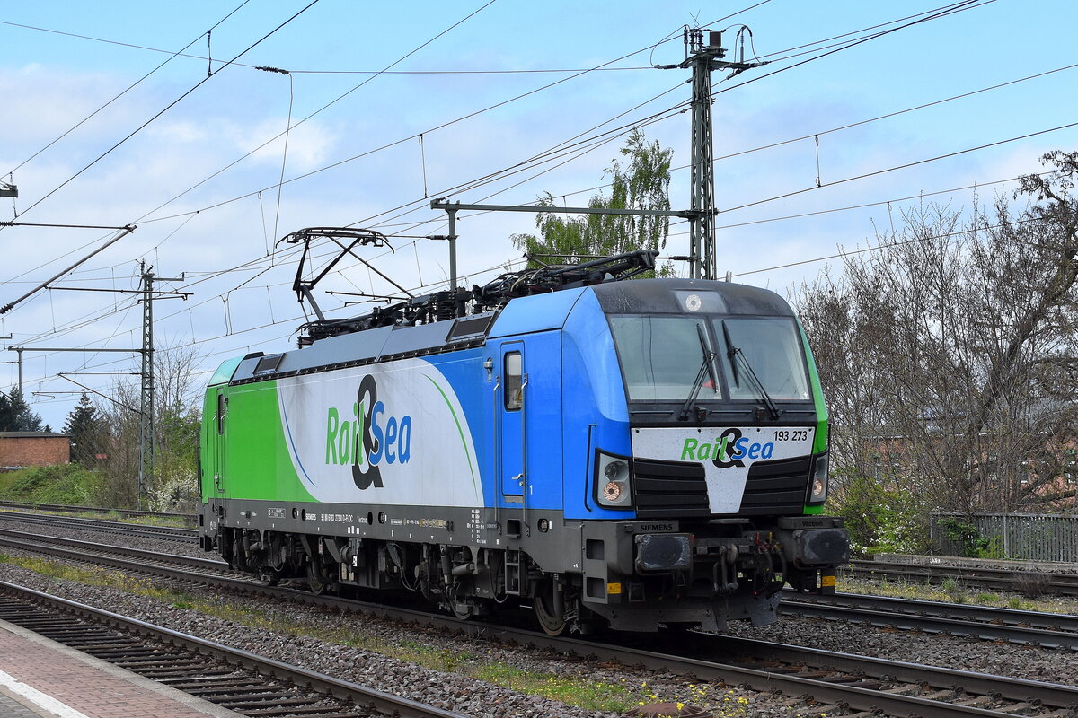 Rail&Sea Logistics GmbH, Seekirchen am Wallersee [A] mit der ELL Vectron "193 273" [NVR-Nummer: 91 80 6193 273-0 D-ELOC] am 02.05.23 Vorbeifahrt Bahnhof Niederndodeleben.