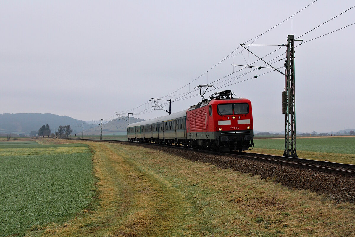 WEE 112 189-6 erreicht den Bahnhof Wörnitzstein mit dem RB89-Ersatzzug von Donauwörth nach Aalen. (04.03.2023)
