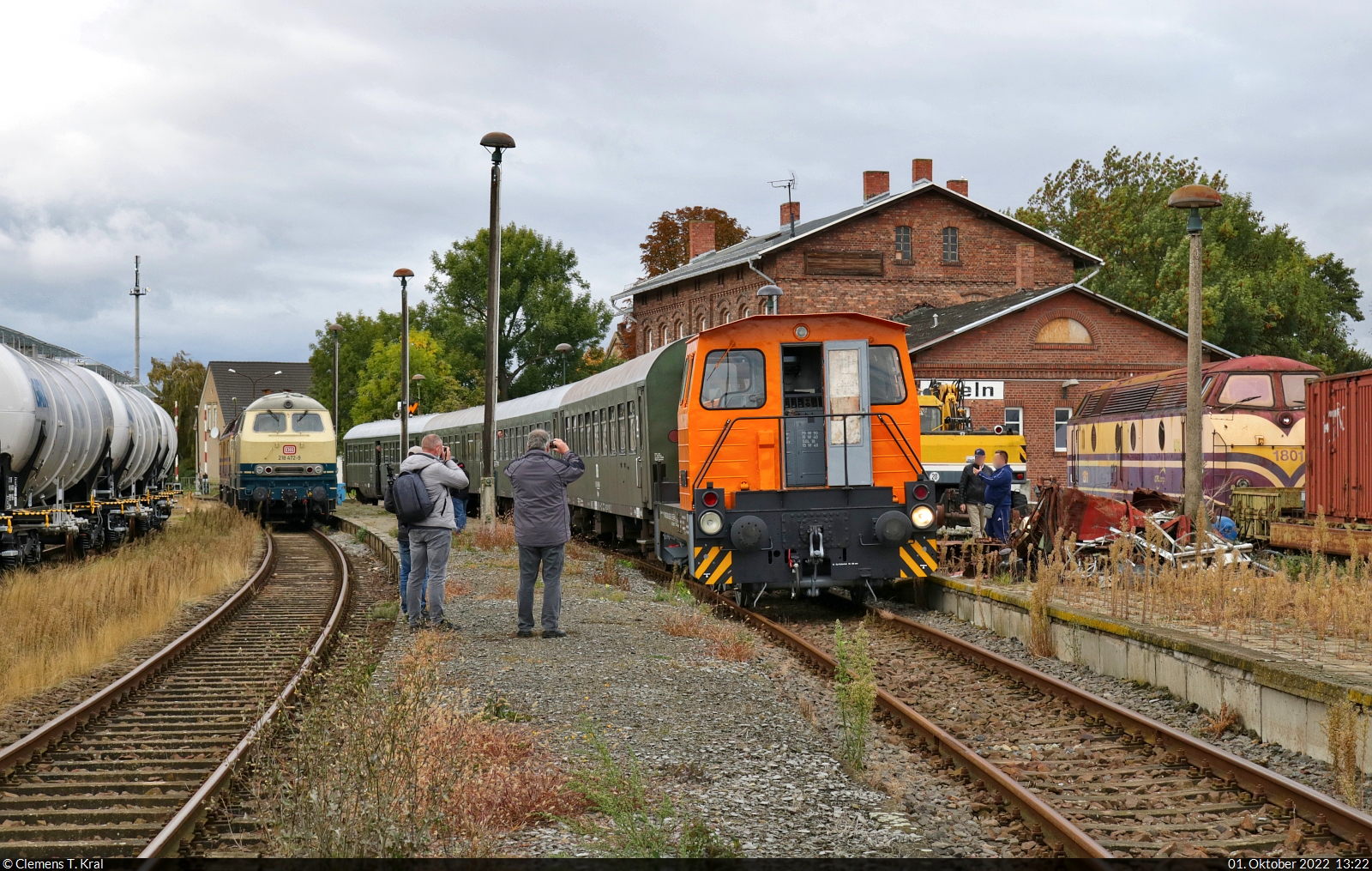 Der Bahnhof Egeln ist auch Parkplatz für etliche alte Dieselloks. Etwas eingekesselt fristet die luxemburgische 1801 neben dem Empfangsgebäude ihr Dasein.