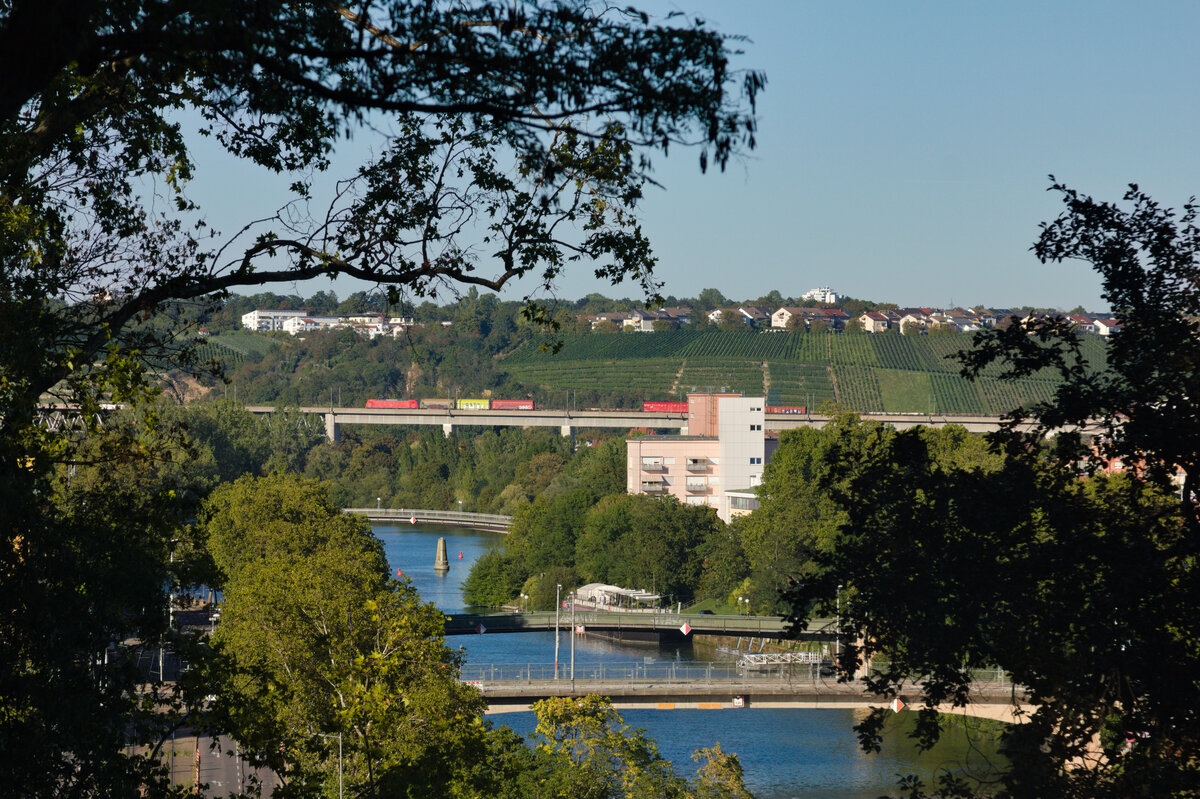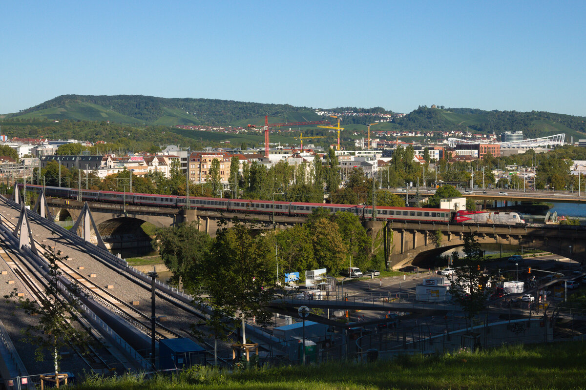 430-Langzug am 04.09.2023 auf der Neckarbrücke in Stuttgart-Bad Cannstatt. Das führende Fahrzeug wirbt dabei als eines von zweien für neue TriebfahrzeugführerInnen.