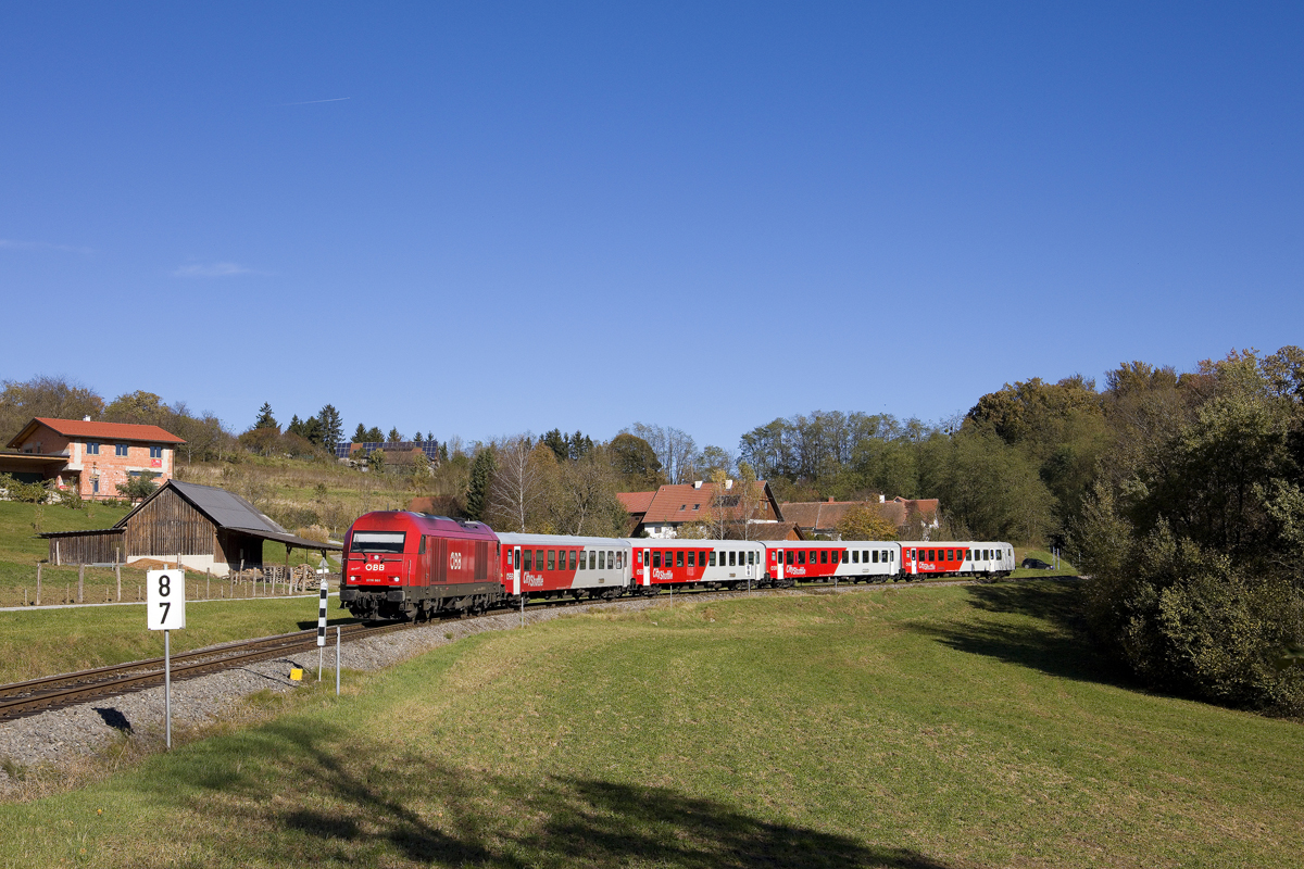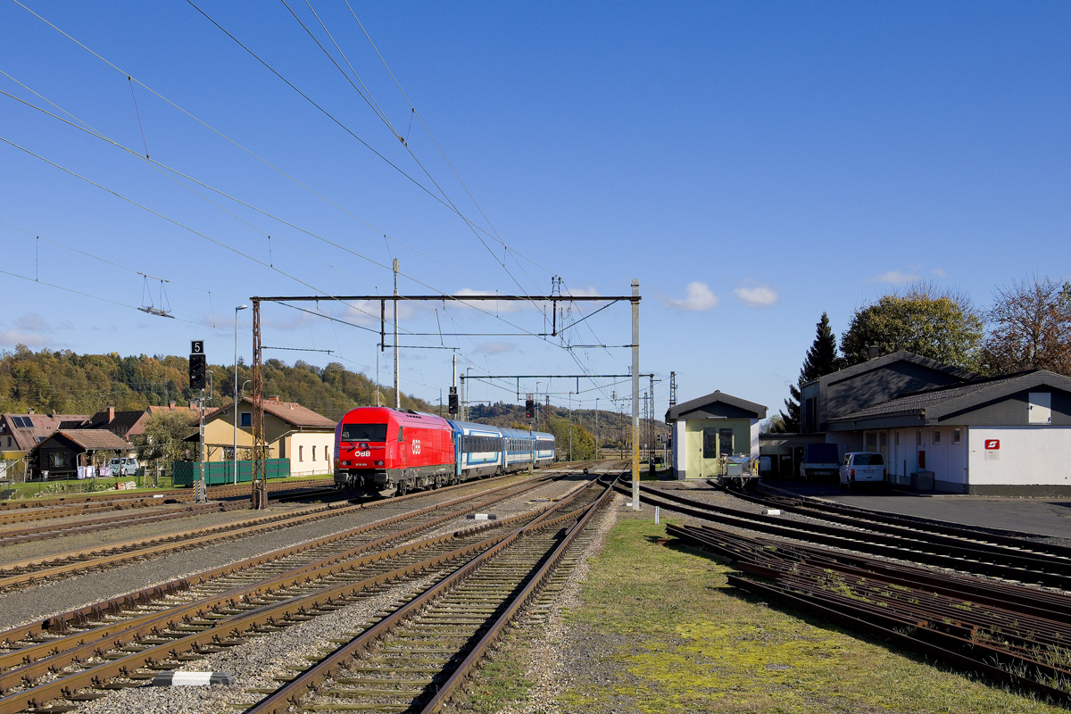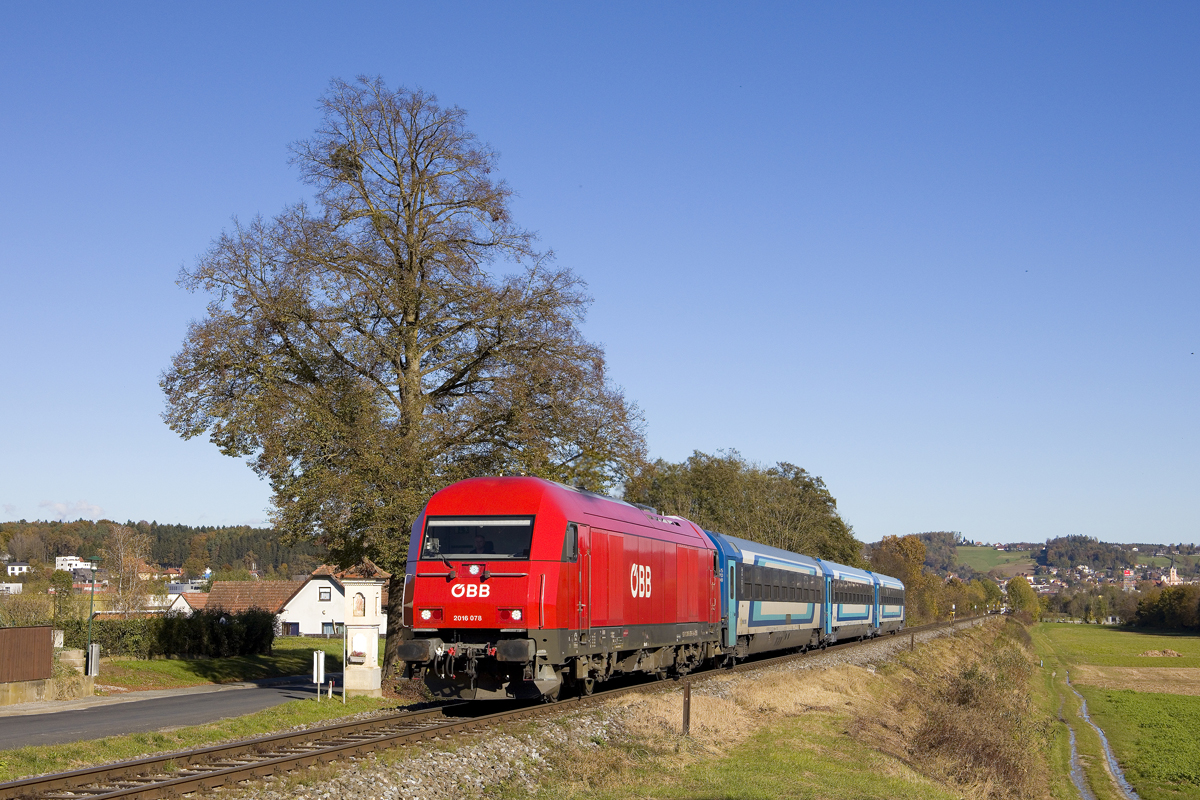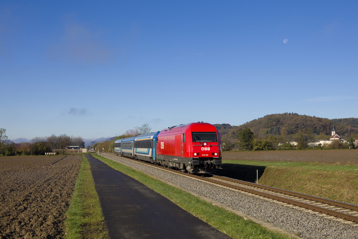 Am 6. November 2023 war 2016 078 mit dem IC 312 (Tatabánya - Graz Hbf) unterwegs. Hier ist der Zug bei Laßnitzthal zu sehen. Rechts im Hintergrund ist die Stadt Gleisdorf zu erahnen.