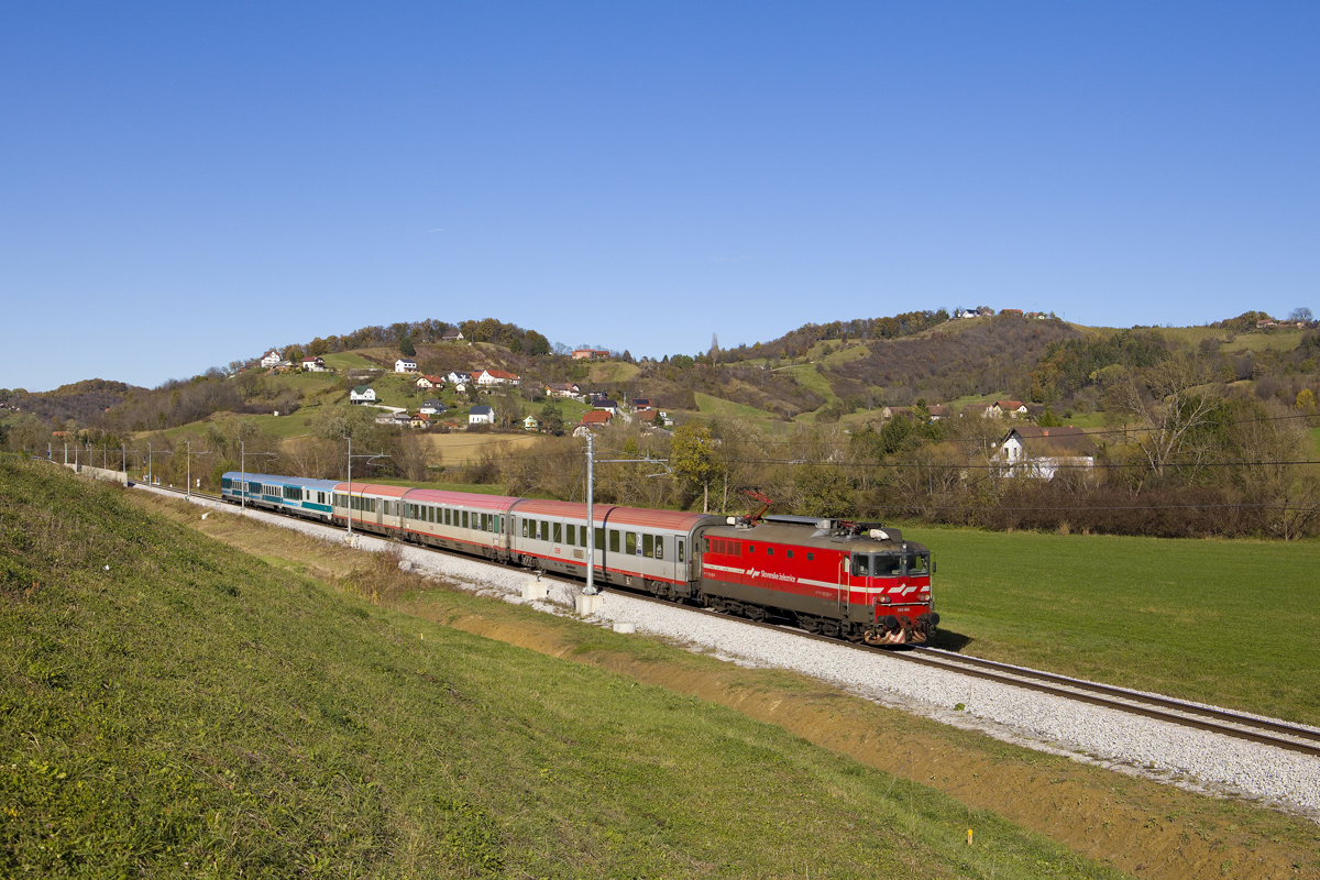 Am 8. November 2023 war der EC 151  Emona  aufgrund einer Streckenunterbrechung im Mürztal stark verspätet unterwegs. Hier ist der Zug, bespannt mit 342 001 bei Cirknica zu sehen.