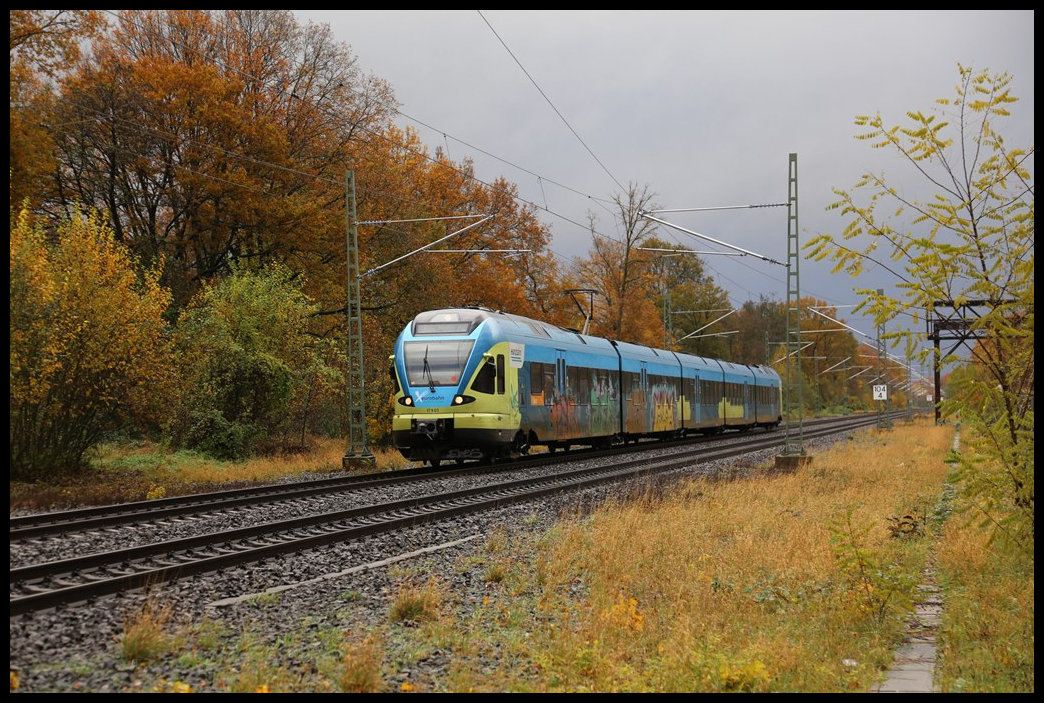 Bei den Herbstfarben fallen die Sprayer Aktivitäten kaum auf. Arg zugesprayt fährt hier am 15.11.2023 um 14.33 Uhr der Eurobahn ET 9.03 auf der Fahrt nach Münster in Natrup-Hagen ein.