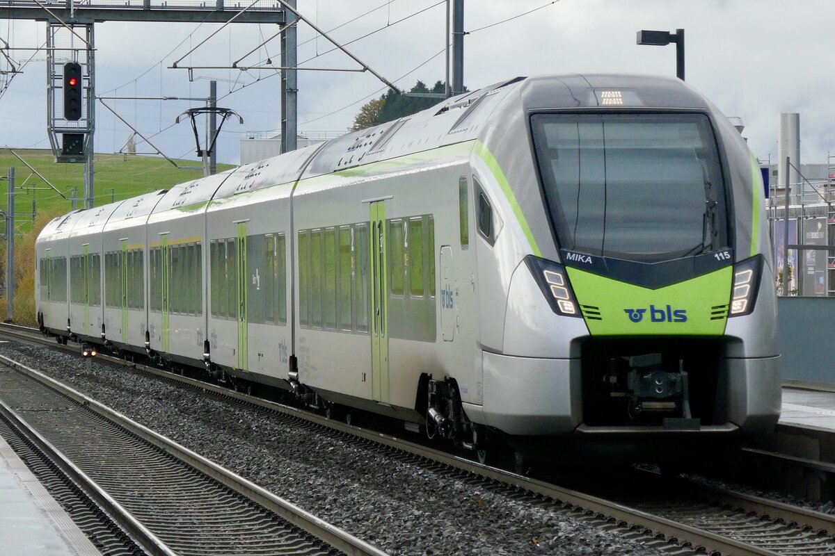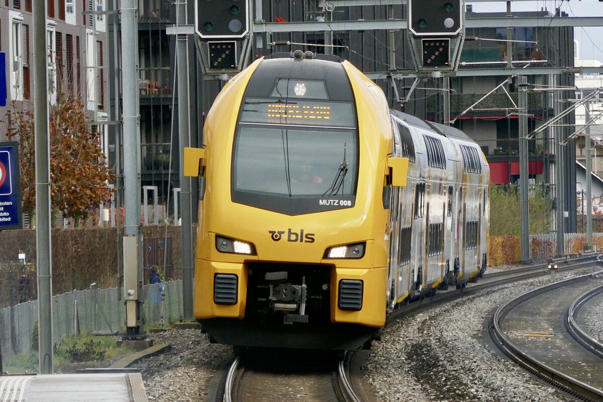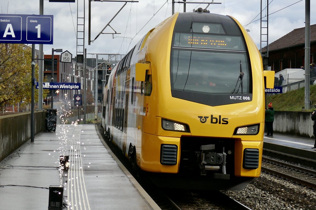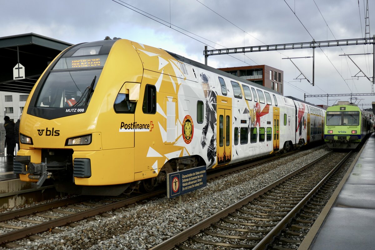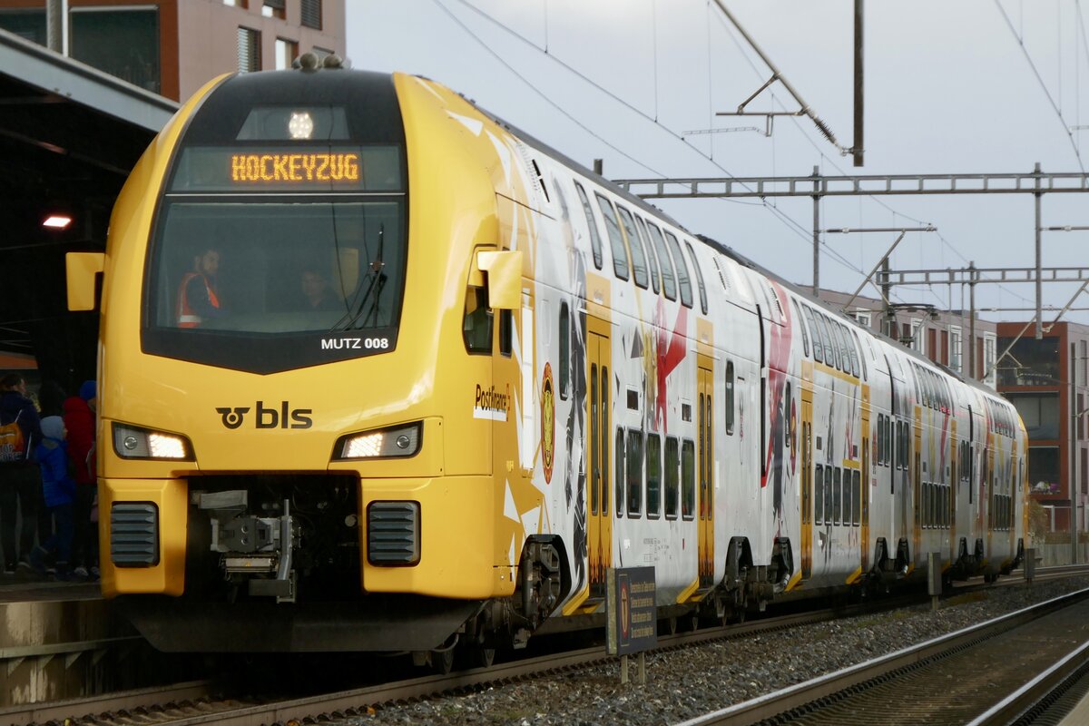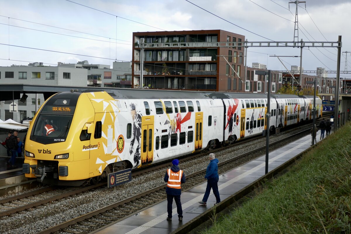Der neue Hockeyzug der BLS RABe 515 008 am 11.11.23 bei der Einfahrt in dem Bahnhof Brünnen Westside.