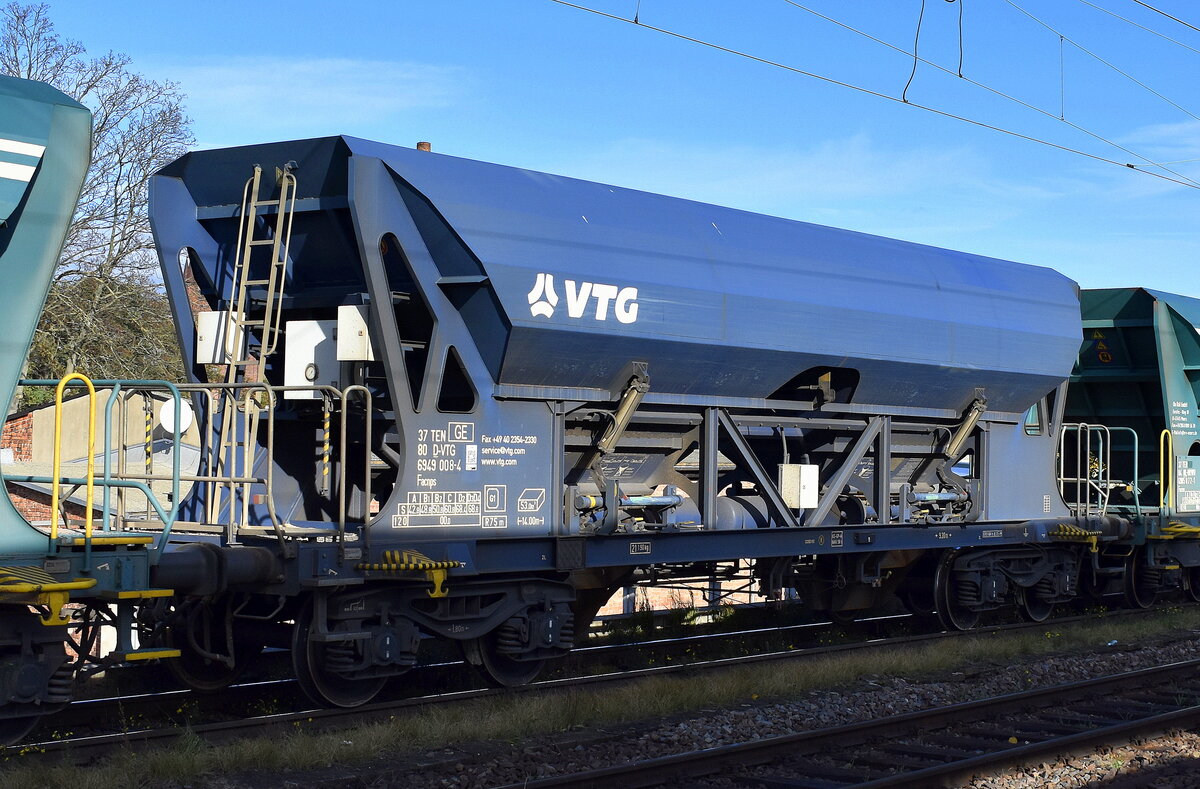 Drehgestell-Schüttgutwagen mit dosierbarer Schwerkraftentladung vom Einsteller VTG mit der Nr. 37 TEN 80 D-VTG 6949 008-4 Facnps (GE) in einem Ganzzug am 07.11.23 Vorbeifahrt Bahnhof Magdeburg Neustadt.