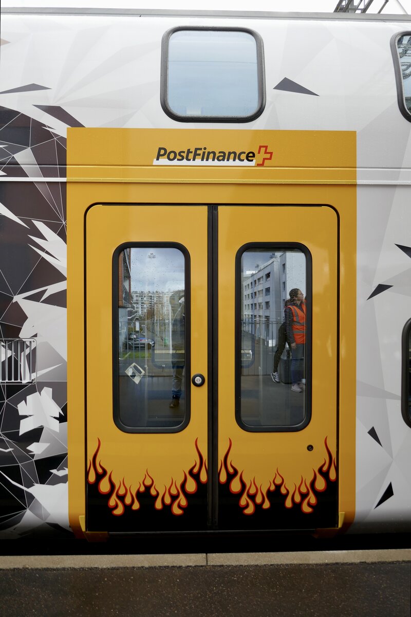 Eine Türe des Hockeyzuges RABe 515 008 im Style der PostFinance Top Scorer am 11.11.23 im Bahnhof Brünnen Wetside.