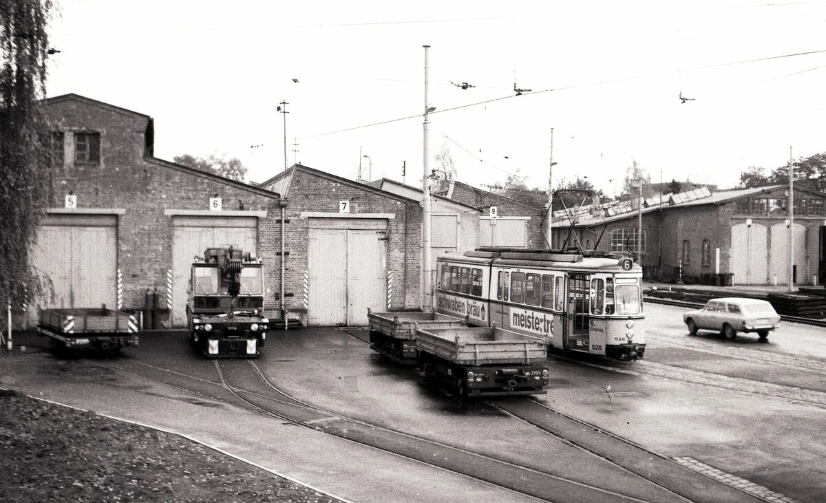 SSB Stuttgart__Arbeitsfahrzeuge der SSB in den 70er und 80er Jahren. Gleismeßwagen 2202 [HKE 1905 ex (Filderbahn/Württ.Nebenbahnen)WN 32; bei SSB 162. Hier bereits zur Rückverwandlung als Museumswagen, zusammen mit "seinem" Tw WN26 von 1912 -bereits im historischen grün-weißen Farbkleid- und weiteren als erhaltenswert abgestellten Fahrzeugen in der oberen Halle des Betriebshofs Ostheim.__05-1974