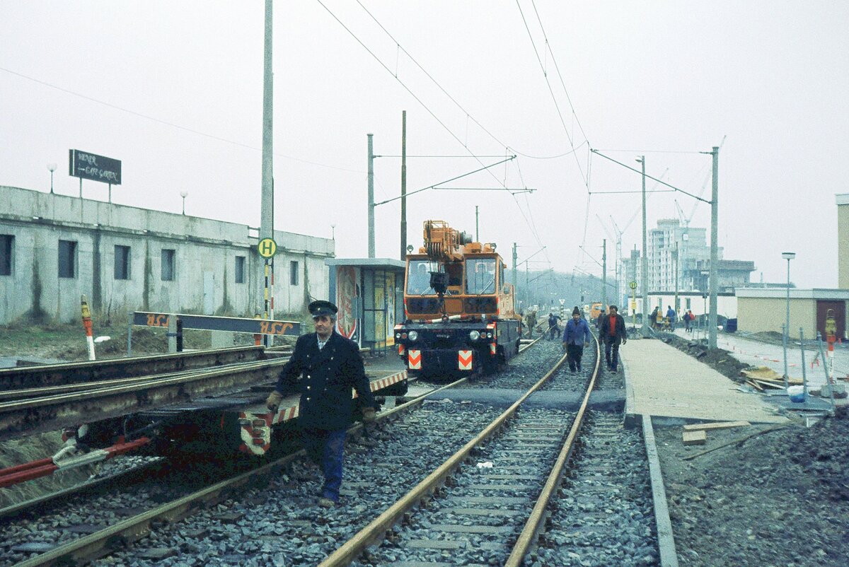 SSB Stuttgart__Arbeitsfahrzeuge der SSB in den 70er und 80er Jahren. Es gibt viel zu tun in den Jahren des "U-Bahn"-Baus. 'Bavaria'-Schienenkran 2502 trifft Arbeits-Lok 2021 [ex Trümmerbahnlok 1; ME/BBC 1946; +1995] mit ihrem Zug in der Königstraße an der im Ausbau befindlchen Tunnelrampr Ri. Hbf.__08-01-1976