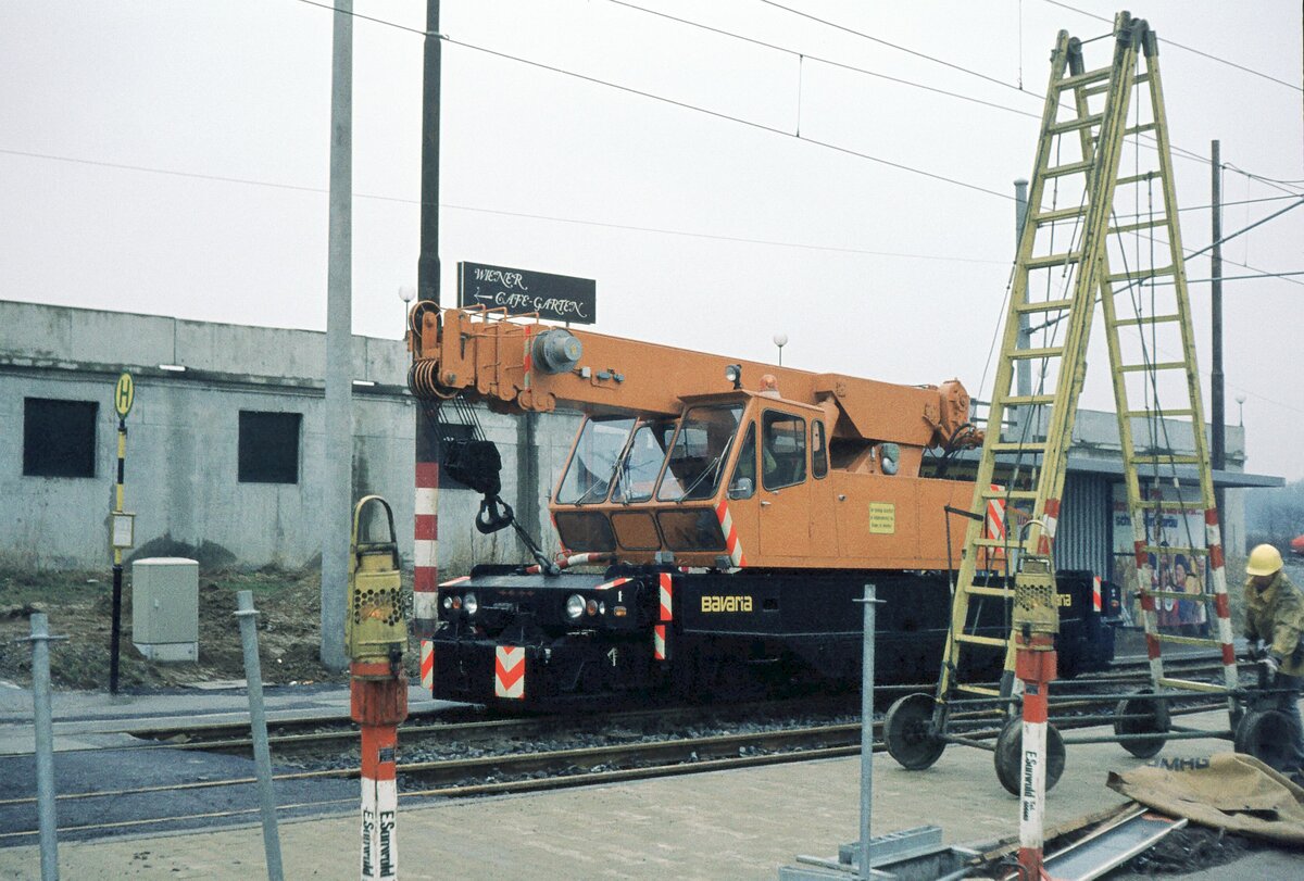 SSB Stuttgart__Arbeitsfahrzeuge der SSB in den 70er und 80er Jahren. 'Bavaria'-Schienenkran 2502 in der Schloßstraße, bei der Liederhalle hat "seine" Baustelle gleich erreicht.__08-01-1976