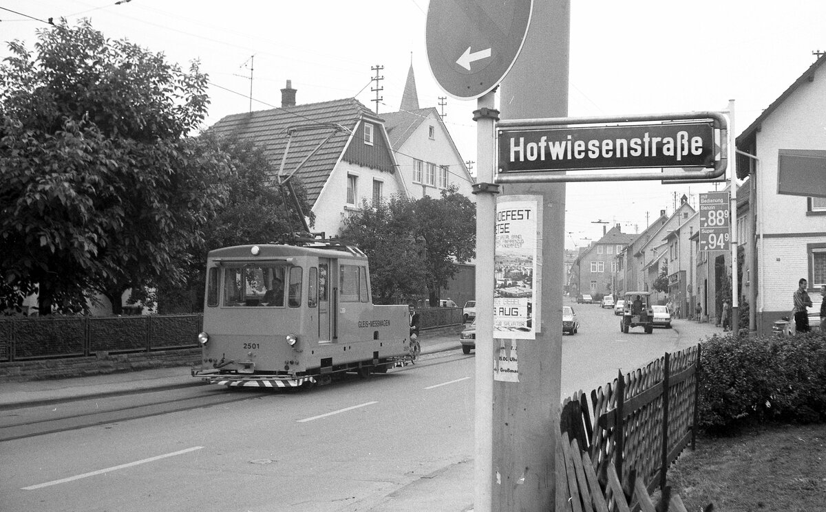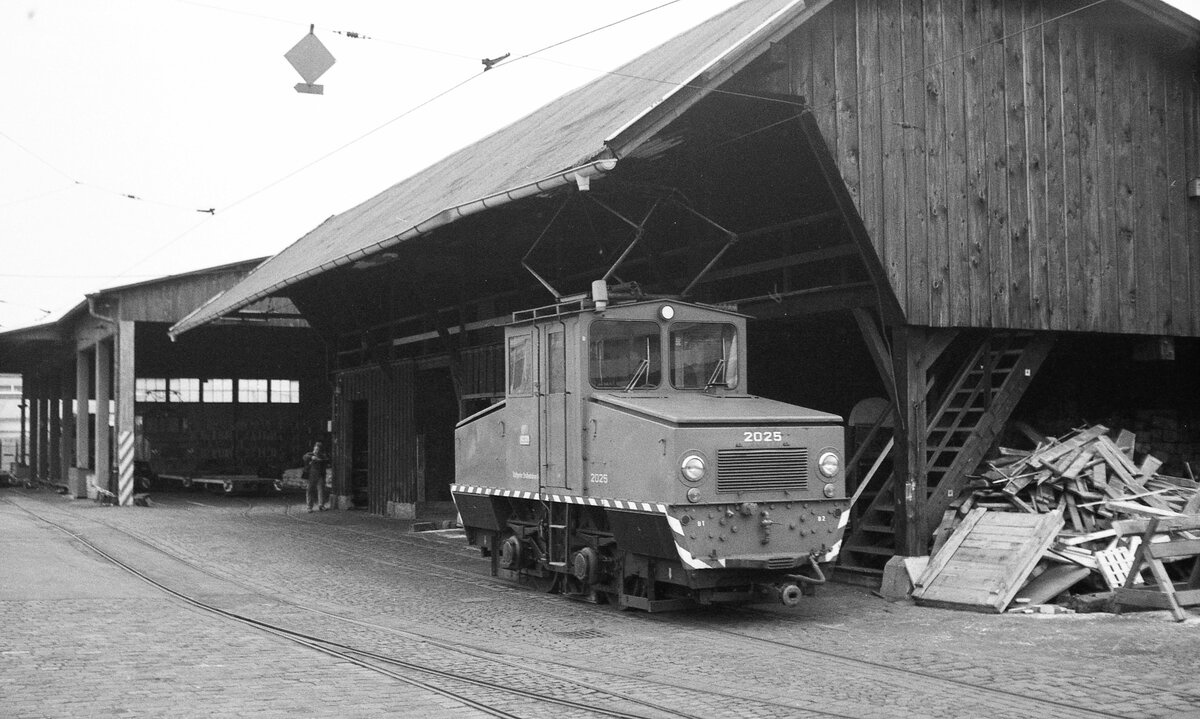 SSB Stuttgart__Arbeitsfahrzeuge der SSB in den 70er und 80er Jahren. A-Lok 2025 [ME/BBC 1946; 1984 V an Würzburger Straßenbahn >Nr.299] im Gleisbauhof S-Wangen__09-01-1976