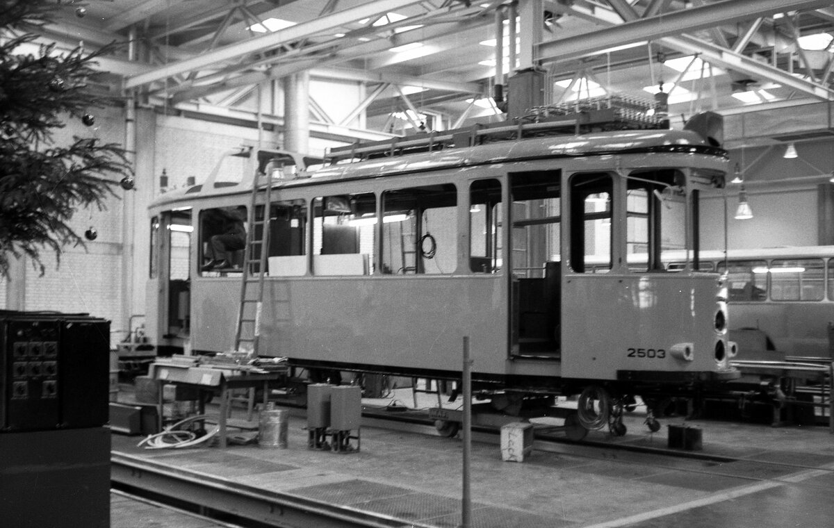 SSB Stuttgart__Arbeitsfahrzeuge der SSB in den 70er und 80er Jahren. 1975/76 wurde der T2 Nr.815 [ME/AEG 1957] in der Hw zum Fahrleitungsmeßwagen 2503 umgebaut. An den letzten Tagen des Jahres 1975 glänzt er schon in neuer Farbgebung gemeinsam mit den Weihnachtsbaumkugeln. __29-12-1975