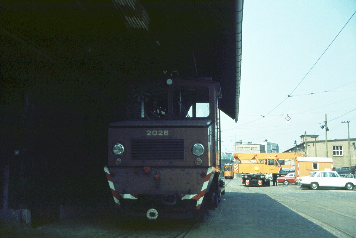 SSB Stuttgart__Arbeitsfahrzeuge der SSB in den 70er und 80er Jahren. A-Lok 2026 [ME/BBC 1946; +1977] im Gleisbauhof S-Wangen. Im Hintergrund 'Bavaria' Schienenkran 2502 und ATw 2002. Besonderes Erlebnis mit Lok 2026 am 22.05.75. Vormittags im Gb.hof Wangen:Flachwagen 2162+63 werden beladen mit 14 Rillenschienen für Versuchsfahrt nachts in U-Bahn. Kurzes Gespräch mit Lokführer.“Ja, wenn Sie mal mitfahren wollen, heute Nacht rechtzeitig hier sein.“Also um 00:09 ab Wangen auf der 2026 mit dabei ! Mit 2 leeren Flachwagen, Schienenkran und 2021 mit 4 Schotterwagen hinterher. Am ‘Stöckach‘ letzte Planzüge abgewartet, dann bis in die Königstr., vorm Kaufhof,ca. 1-2 Uhr Schienen aufgeladen.02:30 via Wilhelmsbau zur ‘Staatsgalerie‘.Ich dort raus,2021+4 Schotterwagen machen bis 02:30 Versuchsfahrten zw. Staatsgal./Charlottenplatz,dann nach Wangen,Flachwagen mit Schienen holen. 03:15 bis 04:00 bei Indusi(IZB)-Meßfahrten im Tunnel zugeschaut: 2026+2162+2163 beladen mit 14 Rillenschienen à 18m.Unter Aufsicht des Projektverantwortlichen, Herrn A.Und ich kann heute selbst kaum glauben, wie problemlos solch ein  Abenteuer“ damals möglich war.__22-05-1975
