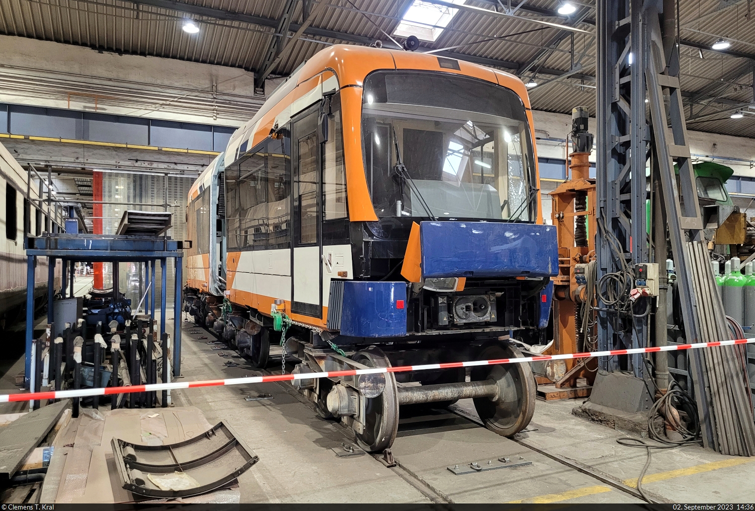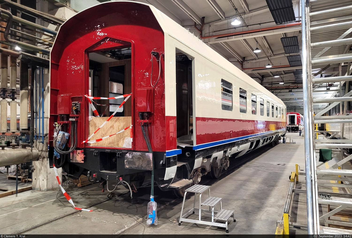 Aktuell wird bei der Verkehrs Industrie Systeme GmbH (VIS) in Halberstadt ein DR VT 18.16 wieder flottgemacht. Ein Wagen hat schon neuen Lack bekommen und präsentierte sich den Besuchern bei einem Tag der offenen Tür. In den vergangenen beiden Jahren wurden die einzelnen Wagen ins Werk überführt, was unter anderem dieses und dieses Bild zeigt. 🧰 DB Museum, verliehen an SVT Görlitz gGmbH 🕓 2.9.2023 | 14:42 Uhr