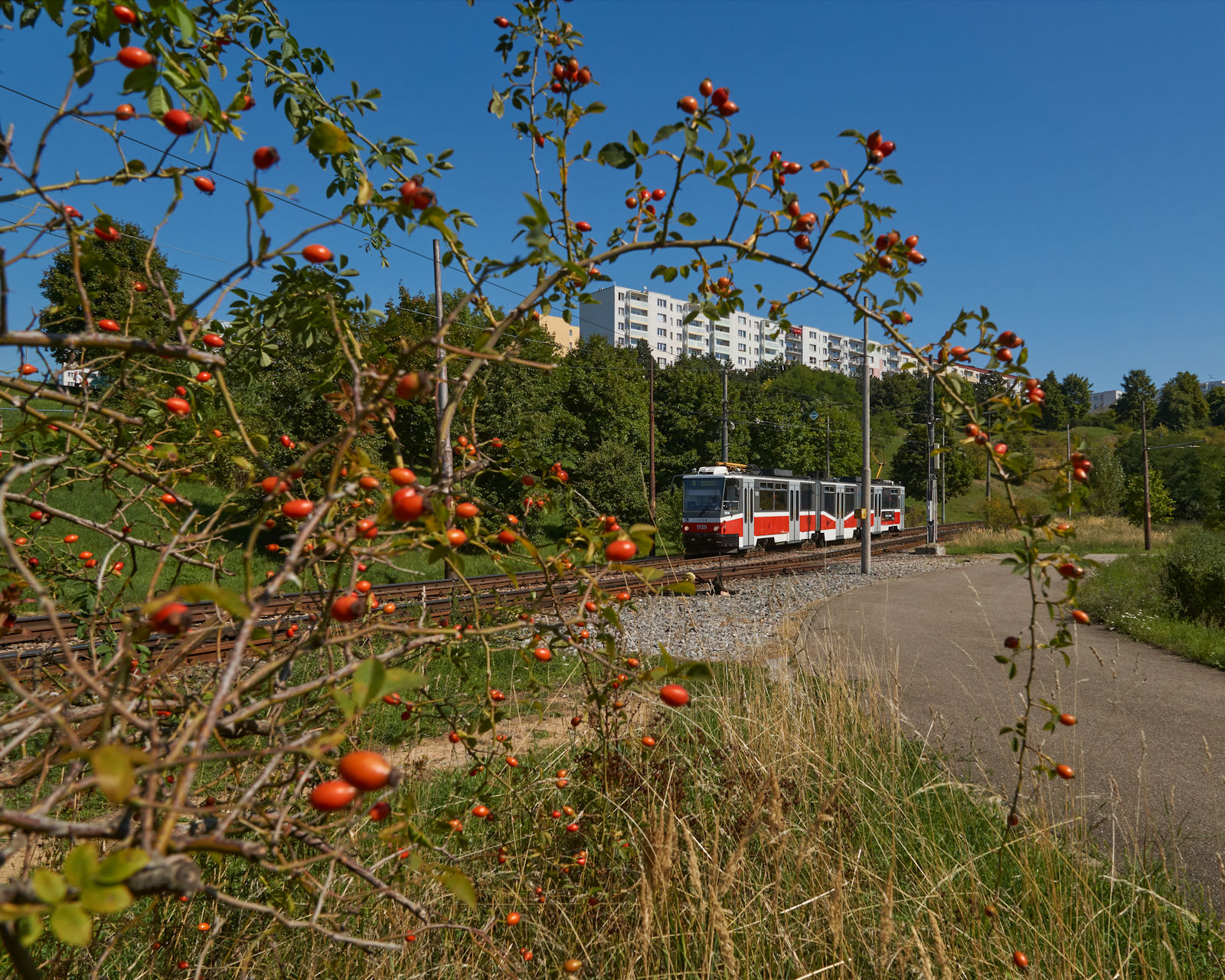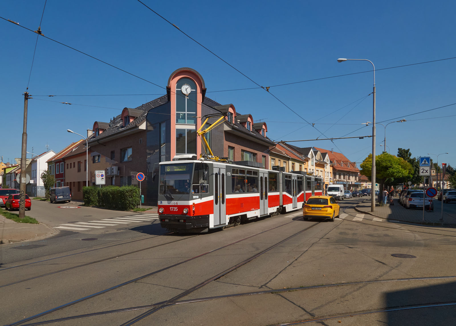 Der Brünner T3R.EV 1562 war am 06.09.2023 mit 1560 unterwegs-  Auf der Linie 6 nach Stary Liskovech verlässt der Zug gerade den Mendel-Platz, wobei sich der zweite Triebwagen sehr schön im Lack des führenden Triebwagens spiegelt..