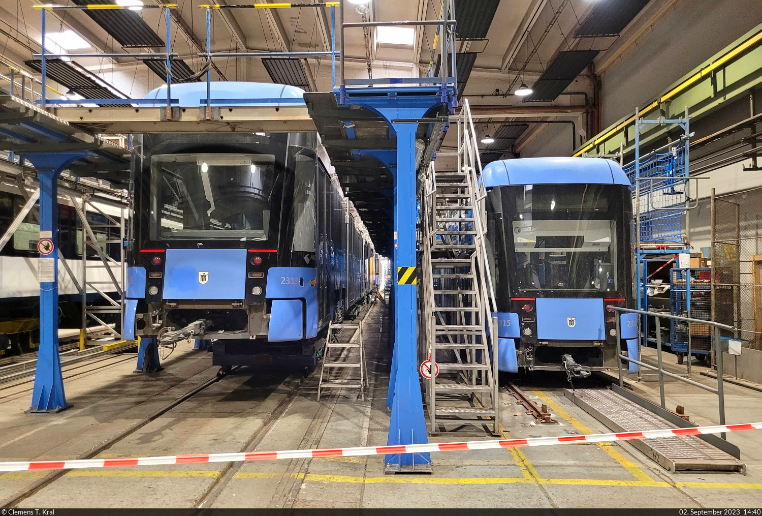 Der Brünner T3R.EV 1562 war am 06.09.2023 mit 1560 unterwegs- Auf der Linie 6 nach Stary Liskovech verlässt der Zug gerade den Mendel-Platz, wobei sich der zweite Triebwagen sehr schön im Lack des führenden Triebwagens spiegelt..