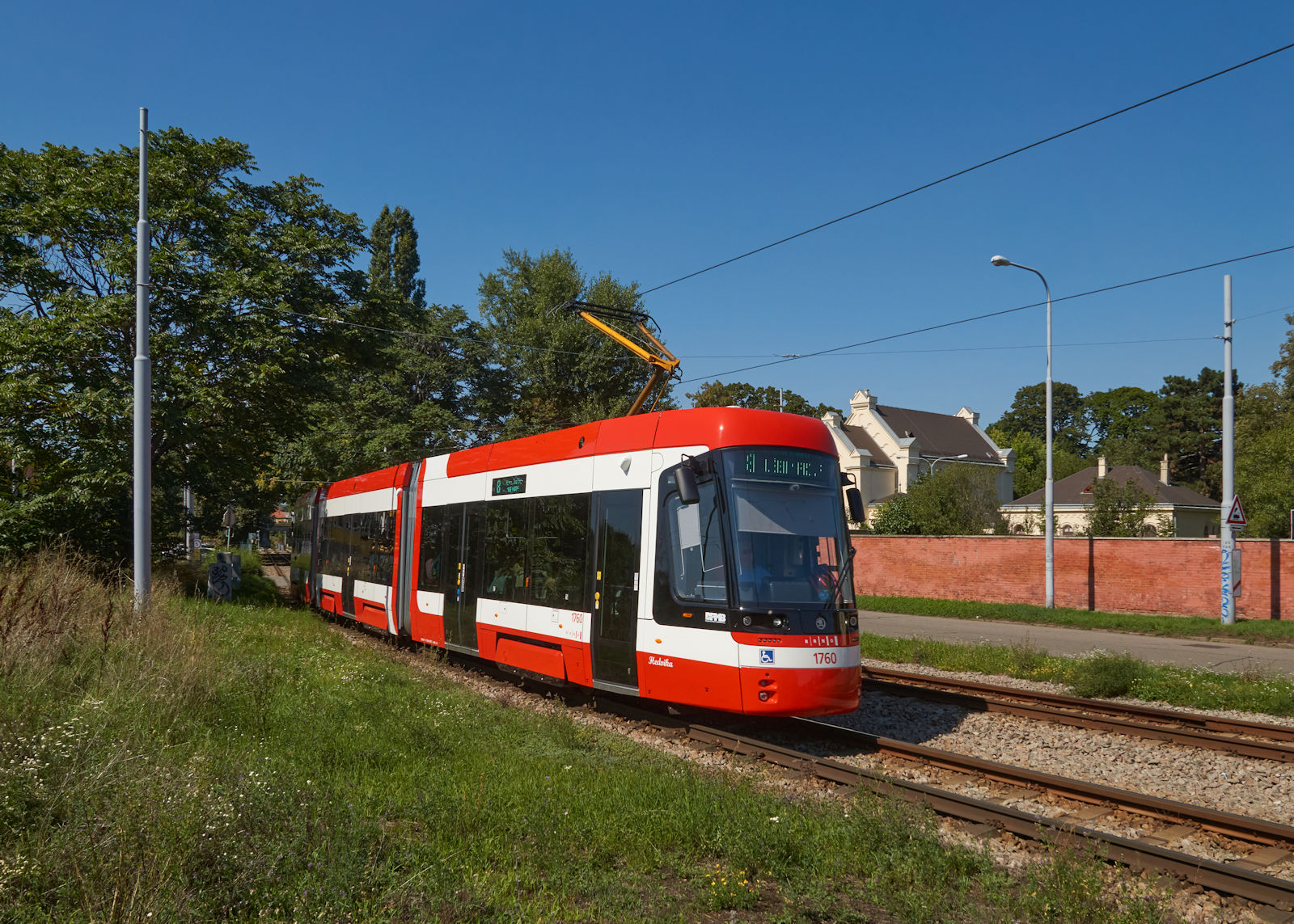 17 Skoda 03T erhielt die Straßenbahn Brünn in den Jahren 2003 bis 2006. Am 06.09.2023 war 1816 auf der Linie 5 als Verstärker unterwegs, der am Mendelplatz endet.