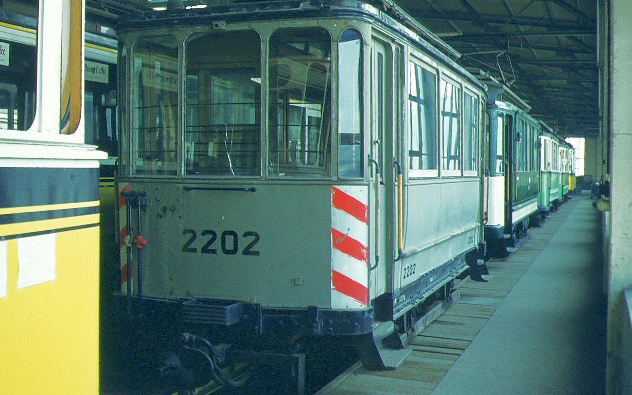 SSB Stuttgart__Arbeitsfahrzeuge der SSB in den 70er und 80er Jahren. Gleismeßwagen 2202 [HKE 1905 ex (Filderbahn/Württ.Nebenbahnen)WN 32; bei SSB 162. Hier bereits zur Rückverwandlung als Museumswagen, zusammen mit  seinem  Tw WN26 von 1912 -bereits im historischen grün-weißen Farbkleid- und weiteren als erhaltenswert abgestellten Fahrzeugen in der oberen Halle des Betriebshofs Ostheim.__05-1974