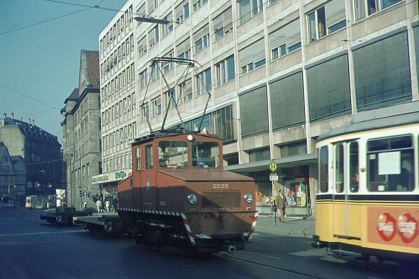 SSB Stuttgart__Arbeitsfahrzeuge der SSB in den 70er und 80er Jahren. A-Lok 2026 [ME/BBC 1946; +1977] im Gleisbauhof S-Wangen. Im Hintergrund 'Bavaria' Schienenkran 2502 und ATw 2002. Besonderes Erlebnis mit Lok 2026 am 22.05.75. Vormittags im Gb.hof Wangen:Flachwagen 2162+63 werden beladen mit 14 Rillenschienen für Versuchsfahrt nachts in U-Bahn. Kurzes Gespräch mit Lokführer.“Ja, wenn Sie mal mitfahren wollen, heute Nacht rechtzeitig hier sein.“Also um 00:09 ab Wangen auf der 2026 mit dabei ! Mit 2 leeren Flachwagen, Schienenkran und 2021 mit 4 Schotterwagen hinterher. Am ‘Stöckach‘ letzte Planzüge abgewartet, dann bis in die Königstr., vorm Kaufhof,ca. 1-2 Uhr Schienen aufgeladen.02:30 via Wilhelmsbau zur ‘Staatsgalerie‘.Ich dort raus,2021+4 Schotterwagen machen bis 02:30 Versuchsfahrten zw. Staatsgal./Charlottenplatz,dann nach Wangen,Flachwagen mit Schienen holen. 03:15 bis 04:00 bei Indusi(IZB)-Meßfahrten im Tunnel zugeschaut: 2026+2162+2163 beladen mit 14 Rillenschienen à 18m.Unter Aufsicht des Projektverantwortlichen, Herrn A.Und ich kann heute selbst kaum glauben, wie problemlos solch ein "Abenteuer“ damals möglich war.__22-05-1975
