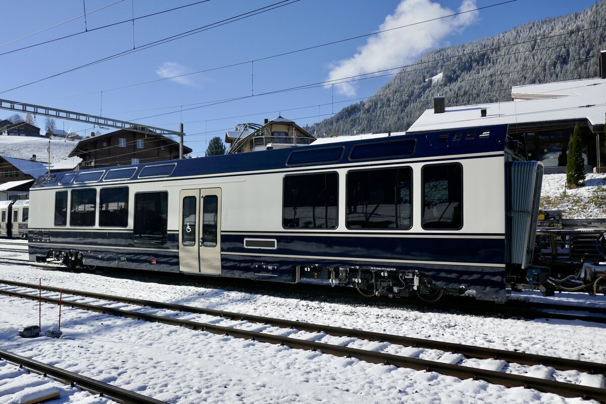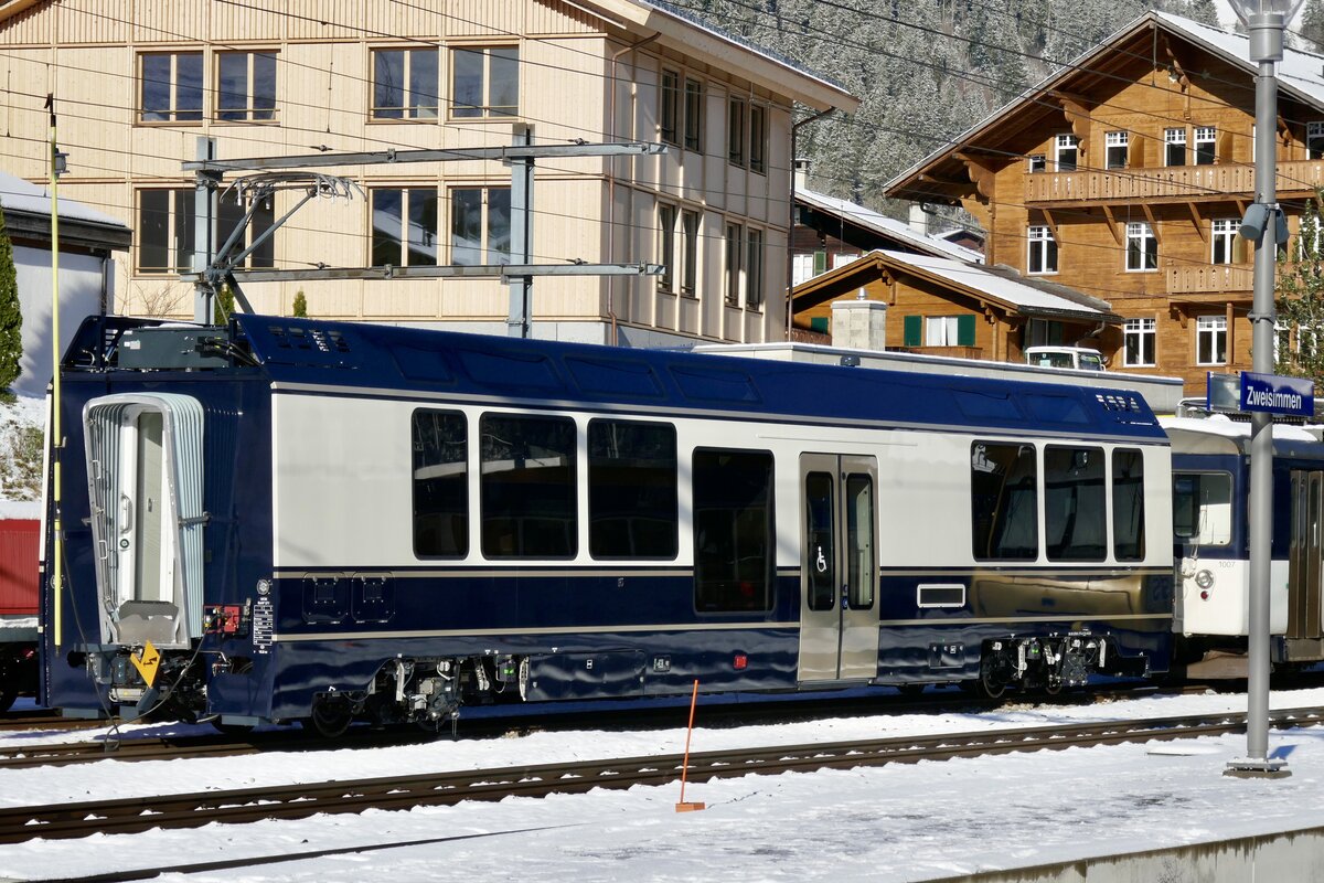Der GPX Steuerwagen 384-1 mit der Komp 4 "Shania Train" der aus Interlaken kam und später wieder zurück nach Interlaken fährt am 26.11.23 im Bahnhof Zwesimmen.