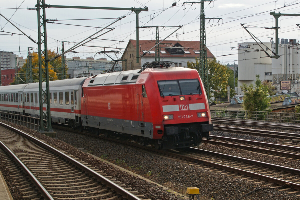 DB 101 066 "Einziganders" hat am 22.11.2023 den IC "Königssee" am Haken, als die Maschine um die Kurve hinter dem Würzburger Hbf kommt.