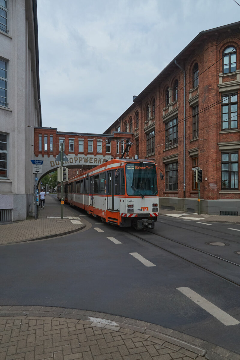 Mittlerweile wird die Strecke in der Brackweder Hauptsraße in Bielefeld auf Stadtbahnniveau umgebaut. Als M8D 581 mit seinem Zug aus einem weiteren M8D und einem MB4 am 16.05.2023, nahe der Brackweder Kirche auf dem Weg nach Schildesche war, war davon noch nicht viel zu sehen.