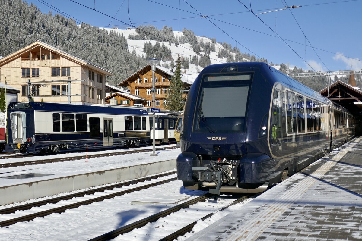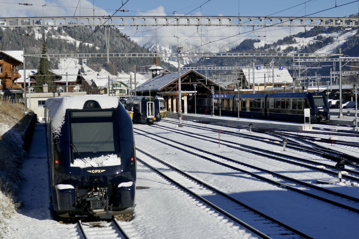 Der neue Niederflurwagen 271-0 (auch noch bei Tag) für die GPX Züge am 26.11.23 im Bahnhof Zweisimmen.