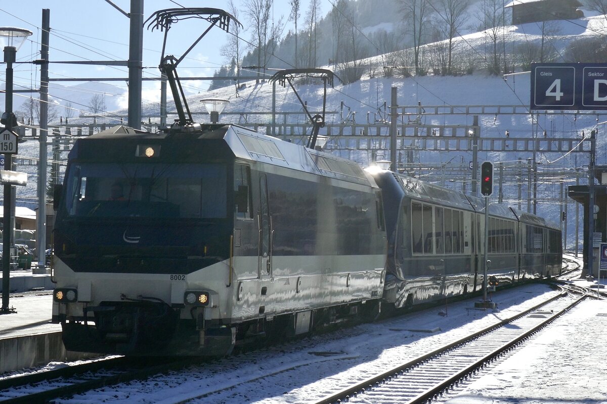 Die MOB Ge 4/4 8002 mit der GPX Komp 1 "Montreux" der am 26.11.23 aufs Gleis 5 in Zweisimmen einfährt, damit man auf die bereitstehende Komp umsteigen kam um weiter nach Interlaken zu gelangen.