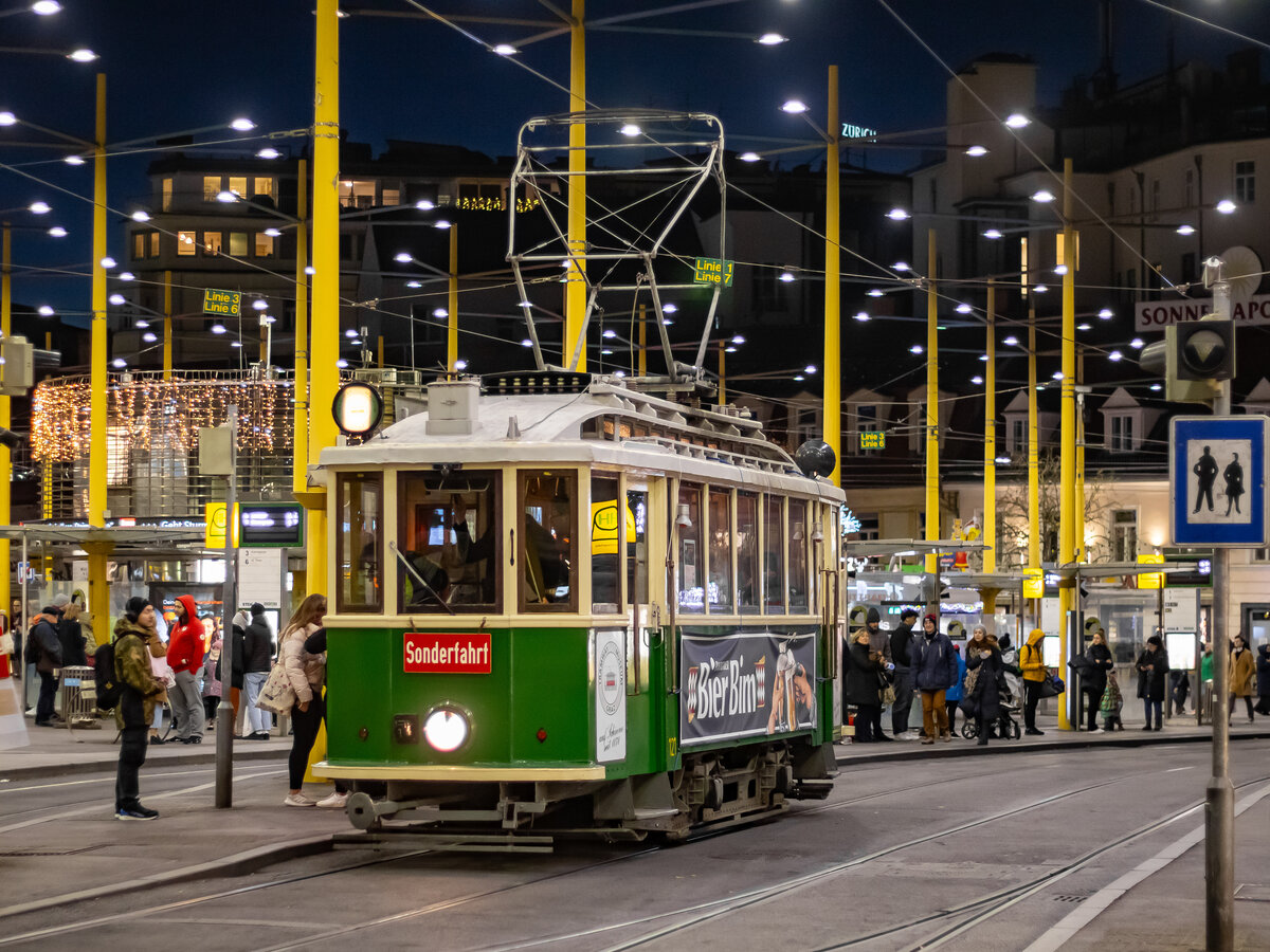 Graz. Der Oldtimer 121 des Tramway Museum Graz, ist hier am 25.11.2023 während einer nächtlichen Sonderfahrt am Jakominiplatz zu sehen.