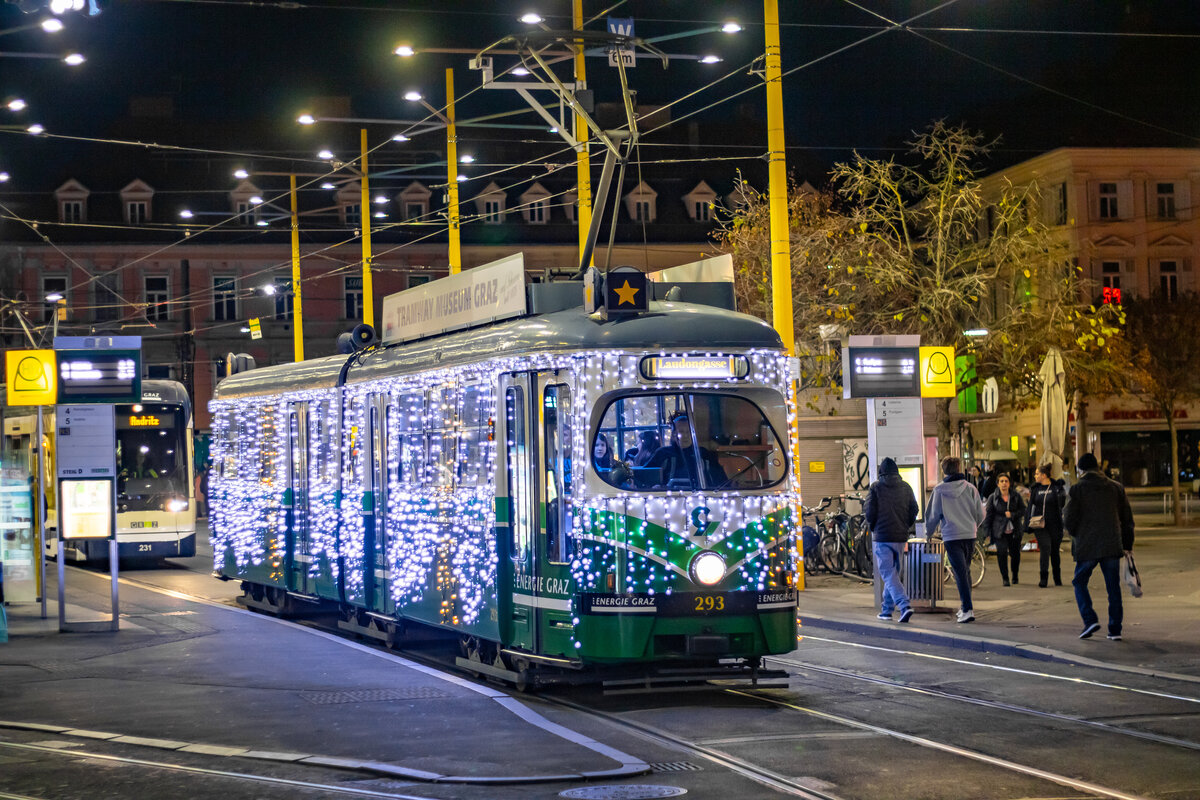 Graz. TW 293 des Tramway Museum ist hier am 25.11.2023 als Adventbim am Jakominiplatz zu sehen.